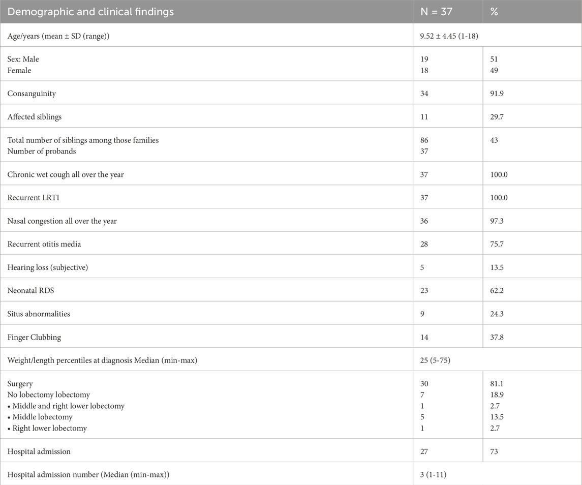 Among the 37 individuals with confirmed genetic diagnosis, a history of year-round nasal congestion was reported in 97.3% of the individuals. Additionally, 75.7% had history of recurrent otitis media, presenting with hearing loss, otorrhea, aural fullness and otalgia. Subjective hearing loss, characterized by defective listening, communication, and conversation, was reported by 13.5% of the cases. A history of neonatal intensive care unit (NICU) admission due to unexplained neonatal RDS requiring oxygen therapy for more than 24 h was noted in 62.2% of the individuals. Situs anomalies were present in 24.3%, with most cases being situs inversus totalis, and only one case with left isomerism. Finger clubbing was observed in 37.8%. Weight and height percentiles were average for all individuals (Table 3).