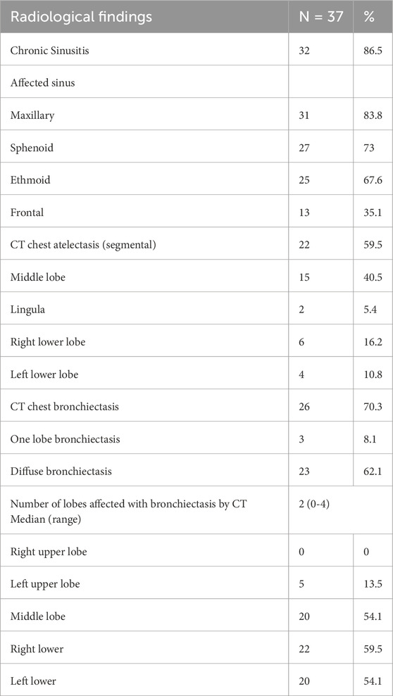 Furthermore, paranasal sinus CT scans revealed that 86.5% of the cases had chronic sinusitis. The most affected sinuses were the maxillary sinuses (83.8%), followed by the sphenoidal (73%) and ethmoidal (67.6%) sinuses. The least affected were the frontal paranasal sinuses (35.1%) (Table 4; Figure 1). In addition, high-resolution chest CT (HRCT) scans showed that 59.5% of the individuals had segmental atelectasis, with 40.5% in the middle lobe and 16.2% in the right lower lobe. Bronchiectasis was present in 70.3% with 62.1% having diffuse bronchiectasis. The common distribution was in the right lower lobe (59.5%), left lower lobe (54.1%), middle lobe (54.1%), and left upper lobe (13.5%) (all confined to the lingula) (Table 4; Figure 1).