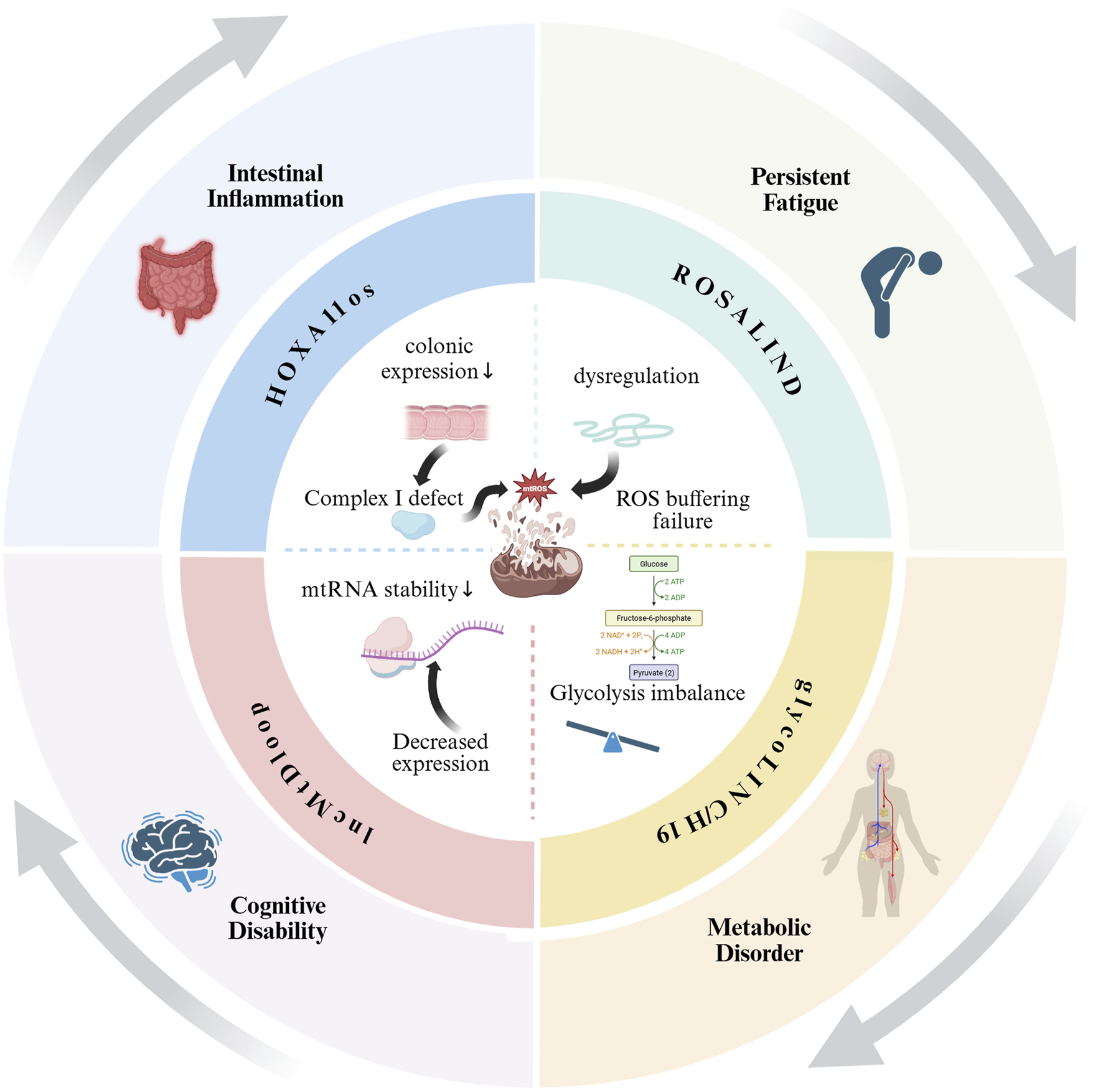 HOXA11os is an LncRNA specifically expressed in the distal colon, and decreased levels of HOXA11os in colonic myeloid cells lead to complex I deficiency, oxidative phosphorylation dysfunction (OXPHOS), and the production of mitochondrial reactive oxygen species (mtROS) (Shmuel-Galia et al., 2023), which may contribute to intestinal dysfunction and inflammation in patients with CFS, if they have defective HOXA11os, and inflammation in the intestinal tract. Mitochondrial dysfunction leads to an increase in the production of ROS in the cell (LeFort et al., 2024), which induces oxidative stress and exacerbates mitochondrial damage (Veluthakal et al., 2024; Mo et al., 2024), whereas a study by Vicky et al. confirmed the role of the LncRNA ROSALIND as a novel ROS buffering system that protected mitochondrial translation from oxidative stress (Katopodi et al., 2025). Many studies have shown that oxidative stress is present in CFS patients (Bjørklund et al., 2020; Shankar et al., 2024; Skare et al., 2024; Sukocheva et al., 2022), so the dysregulation of ROSALIND without protection of dysfunctional mitochondria may be an important reason why fatigue is not alleviated in CFS patients. LncMtDloop, a LncRNA encoded within the D-loop region of the mitochondrial genome, plays a critical role in maintaining mitochondrial RNA levels and function. Although its precise mechanisms remain unclear, recent research has highlighted its potential involvement in neurodegenerative diseases. A study investigating the role of LncMtDloop in Alzheimer’s disease (AD) revealed that its expression levels are significantly reduced in AD patients. Experimental enhancement of LncMtDloop in AD model mice demonstrated a marked improvement in AD-like pathological and behavioral deficits (Xiong et al., 2024). Given that neurocognitive impairment is a shared characteristic between AD and CFS patients (Arron et al., 2024; Liu et al., 2024; Ferreira et al., 2024; Baraniuk et al., 2024b), we hypothesize that the downregulation of LncMtDloop in CFS patients may contribute to their cognitive deficits. However, this hypothesis requires further validation through extensive clinical studies to establish a definitive link between LncMtDloop dysregulation and cognitive impairment in CFS.