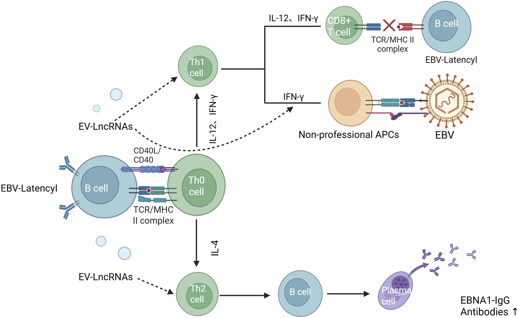 Effect of EV-LncRNAs on the antiviral immune response (Ruiz-Pablos et al., 2021). Notes: EBV-Latency1 B cells can affect the body’s cellular and humoral immune effects byreleasing exosomes that allow LncRNA to act on Th1 and Th2 cells, respectively. In addition, LncRNA can also directly affect the expression of IFN, which induces other cells, such as endothelial cells, epithelial cells, fibroblasts, and glial cells, to express MHC-II molecules and to become non-specialised antigen-presenting cells to be infected with EBV.