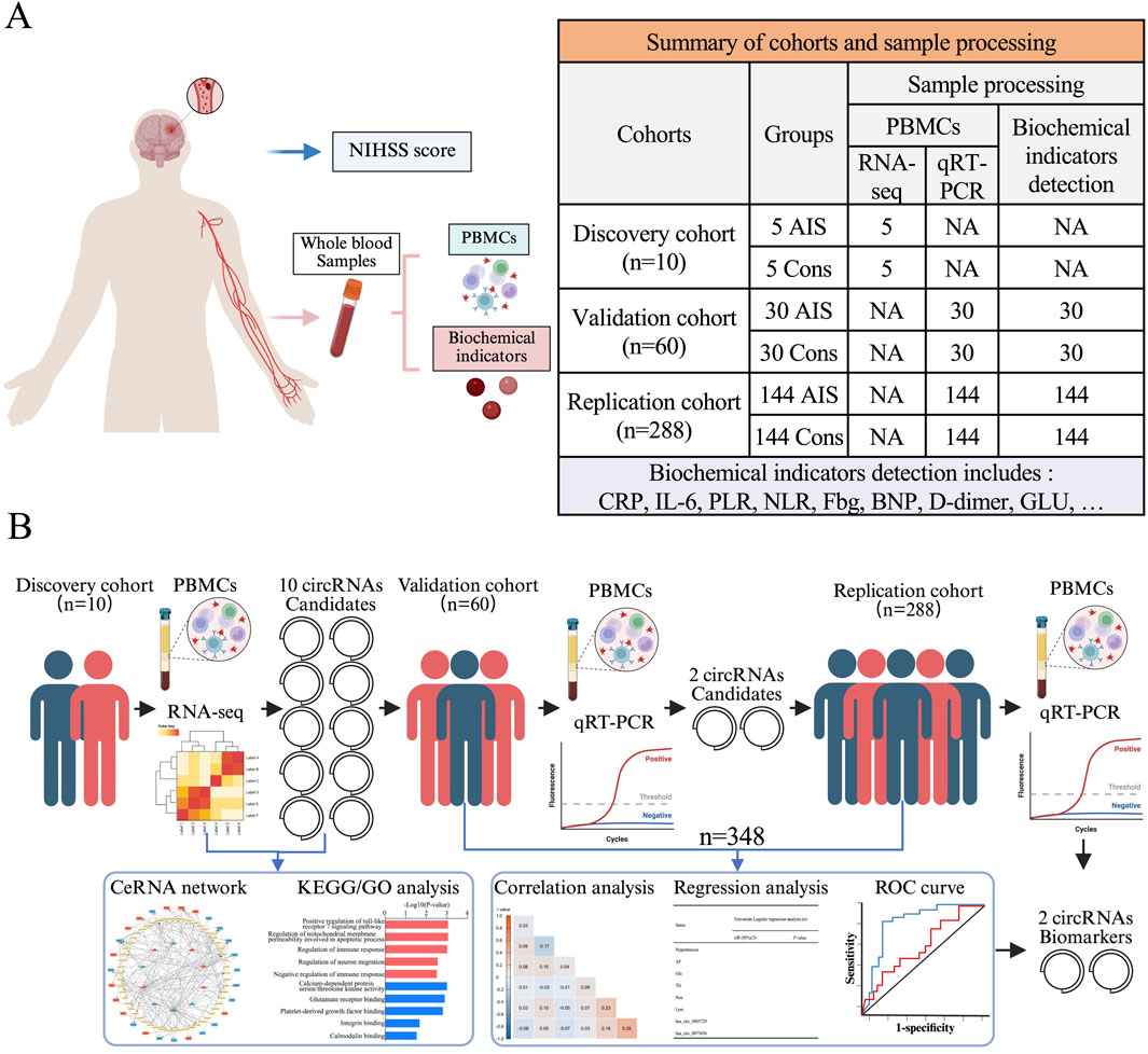 Figure 1. The samples acquisition process and simplified flowchart of circRNA biomarker discovery. (A) Whole blood samples were acquired from all recruited patients followed by PBMCs isolation and biochemical indicators detection, while NIHSS scores were requested only in AIS patients. (B) In this report, a discovery cohort was prospectively recruited to identify specific circRNA molecules in PBMCs of AIS patients via W. HTSeq. A validation cohort and a replication cohort were retrospectively analyzed for verification and correlation with AIS-related indicators.
