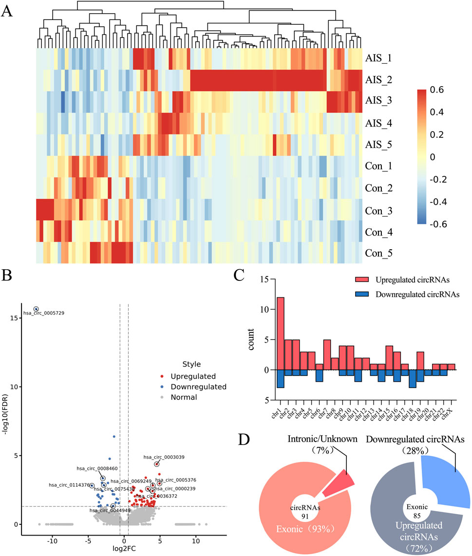 Figure 2. Differentially expressed CircRNA profiles in AIS patients and control subjects. (A) Heat map showing circRNAs differentially expressed between AIS and control groups. (B) Volcano plot illustrating circRNA expression profiles in AIS and control groups. Red dots represent significantly upregulated circRNAs (FC ≥ 1.5 and P < 0.05, n = 5 per group, two-sample t-test). Blue dots represent significantly downregulated circRNAs (FC ≤ −1.5 and P < 0.05, n = 5 per group, two-sample t-test). (C) Bar chart displaying the chromosomal distribution of DECs. (D) Pie chart illustrating the genomic origin of DECs in AIS patients, categorized as exonic, intronic, or unknown. “Exonic” indicates that both ends of the back-splice junction are located within exons; “Intronic” indicates that both ends are located within introns, or one end lies outside the exon region; “Unknown” refers to cases where the back-splice site does not overlap with any annotated transcript.