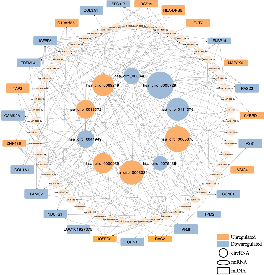 Figure 3. The Network of circRNA-miRNA-mRNA of the top 10 differentially quantified circRNAs. Circular nodes represented circRNAs, elliptical nodes denoted miRNAs, and rounded rectangles indicated mRNAs. Red indicated upregulation, while blue indicated downregulation. The size of circular nodes and rounded rectangles corresponded to the expression variation (log2 FC) of circRNAs and their target mRNAs.