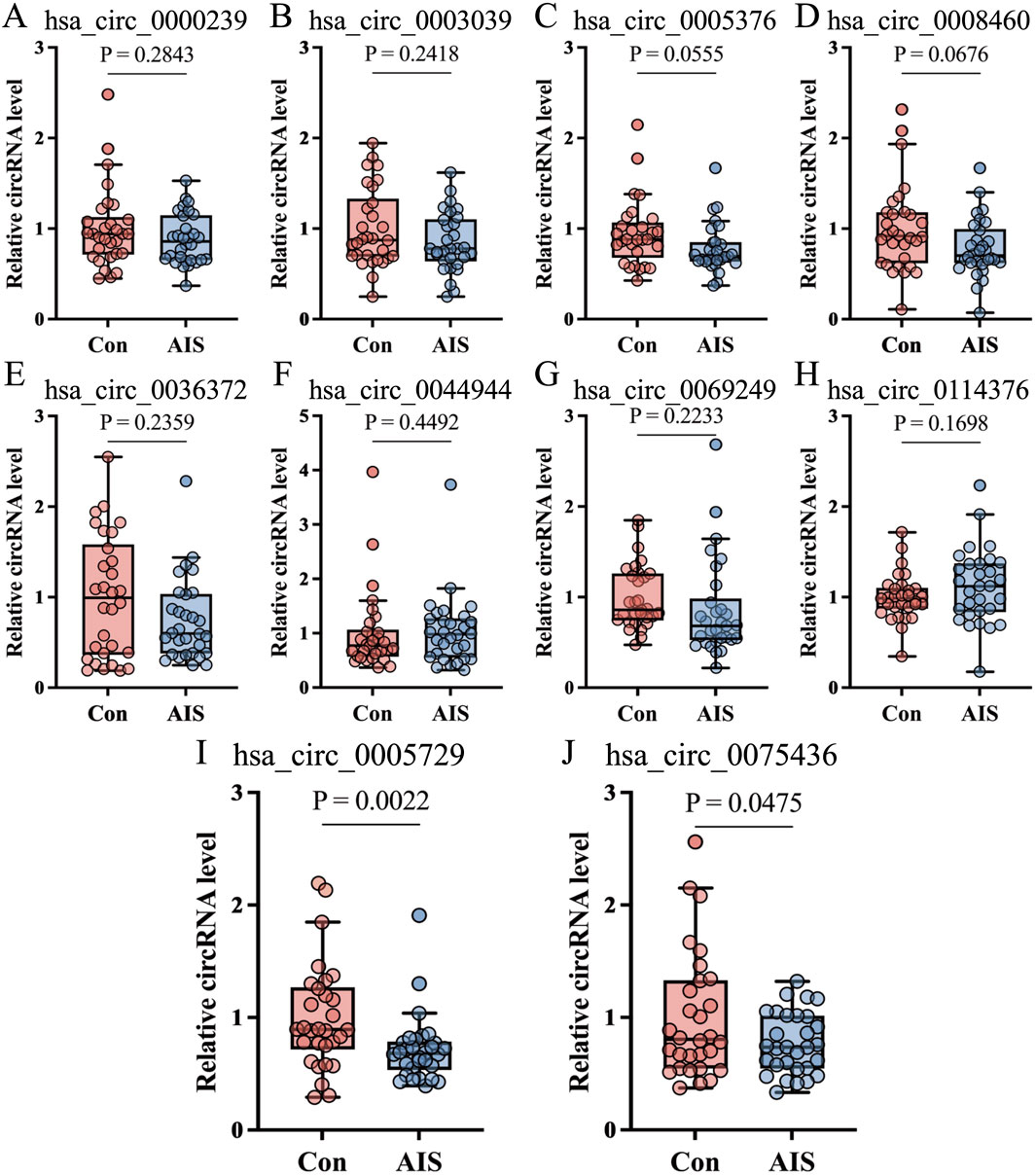 A total of 174 AIS patients and 174 age- and sex-matched healthy controls were recruited. Baseline clinical data of the whole samples are shown in Table 2. From this cohort, 30 subjects from each group were randomly selected to form the validation cohort. qRT-PCR was performed to validate the expression of the top 10 DECs, including five upregulated circRNAs (hsa_circ_0005376, hsa_circ_0003039, hsa_circ_0069249, hsa_circ_0000239, and hsa_circ_0036372) and five downregulated circRNAs (hsa_circ_0005729, hsa_circ_0114376, hsa_circ_0044949, hsa_circ_0008460, and hsa_circ_0075436). Primer sequences are provided in Supplementary Table S3. Among these, hsa_circ_0005729 and hsa_circ_0075436 were significantly downregulated in AIS patients compared to controls (Figures 4A–J).