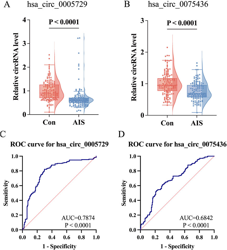 Figure 5. Further validation of hsa_circ_0075436 and hsa_circ_0005729 in replication cohort (n = 288) and ROC curve analysis in the combined cohort (n = 348). (A,B) Expression levels of hsa_circ_0005729 and hsa_circ_0075436 in AIS patients and matched controls (n = 144 per group). Boxplots displayed the median (central line), interquartile range (IQR; box boundaries), with whiskers extending to 1.5 × IQR. Points beyond whiskers were shown as outliers. Violin plots showed the distribution of the data. Statistical significance was determined by the Mann-Whitney U test. (C,D) ROC curve analysis of the two validated circRNAs in the combined cohort (n = 348). The red diagonal line in each graph represents the reference line for no diagnostic discrimination (AUC = 0.500). AIS, acute ischemic stroke; circRNA, circular RNA; qRT-PCR, quantitative real-time polymerase chain reaction; ROC, Receiver operating characteristic.