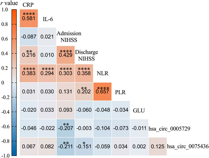 A correlation matrix shows relationships among variables CRP, IL-6, Admission NIHSS, Discharge NIHSS, NLR, PLR, GLU, and two hsa_circ identifiers. Positive correlations range from 0.202 to 0.581. Notable high correlations include CRP with IL-6 (0.581) and NLR with PLR (0.657). Significance is marked with asterisks, with color coding indicating the strength and direction of correlations: red for positive and blue for negative.
