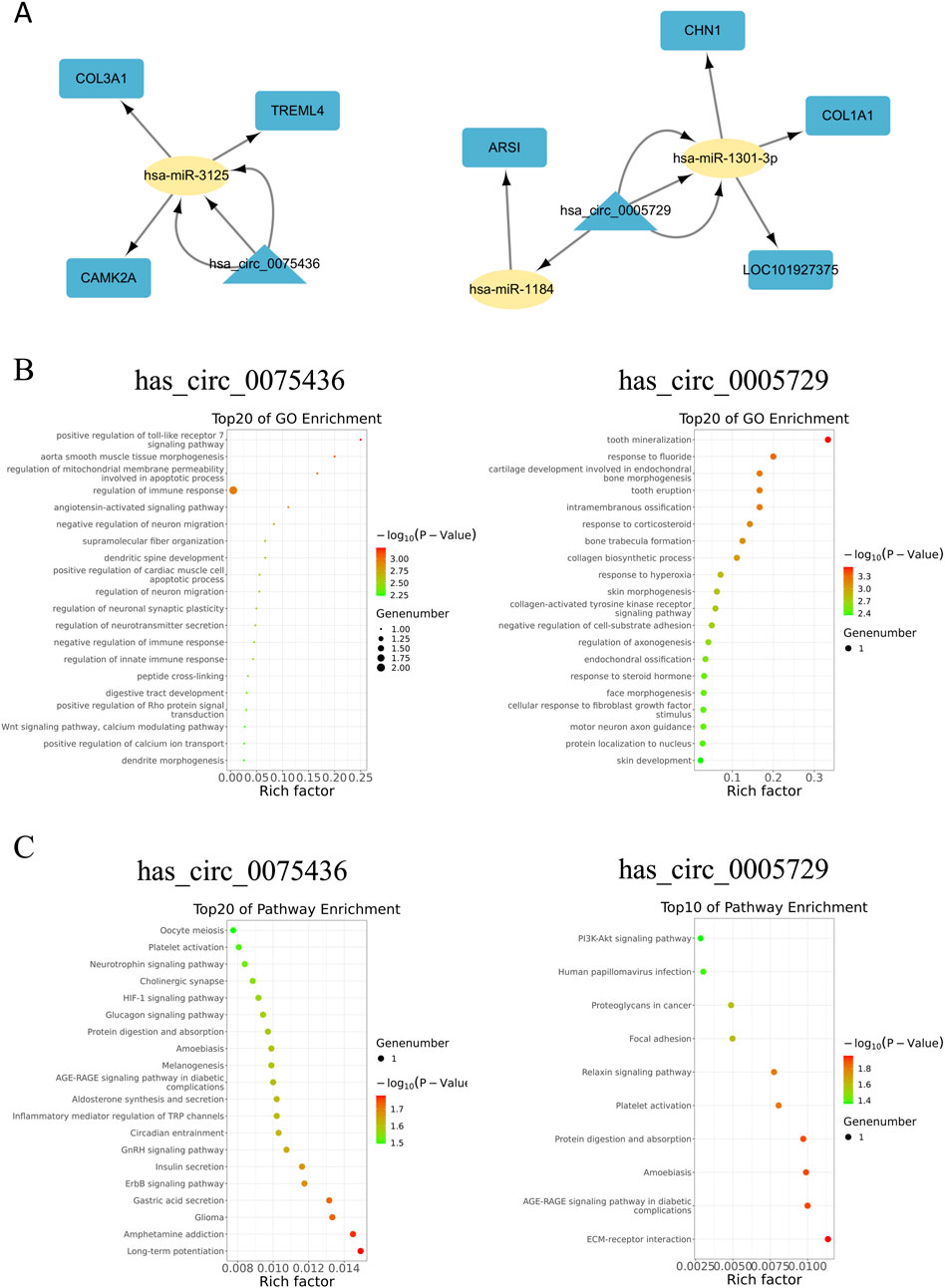 Diagram illustrating gene-miRNA interactions and enrichment analyses. Panel A shows gene interaction networks involving COL3A1, TREML4, hsa_circ_0075436, CAMK2A, among others. Panels B and C display GO and pathway enrichment data for hsa_circ_0075436 and hsa_circ_0005729, showing various biological processes and pathways, with details on rich factor and significance levels.