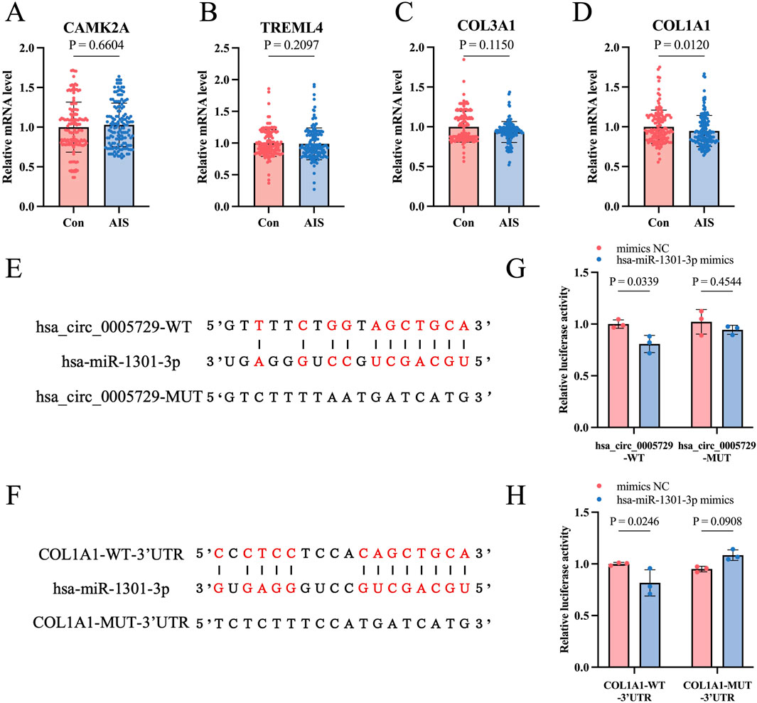 We validated the mRNA levels of CAMK2A, TREML4, COL3A1, and COL1A1—predicted target genes of hsa_circ_0075436 and hsa_circ_0005729 implicated in inflammatory responses and matrix remodeling—using qRT-PCR in the replication cohort. Primer sequences are provided in Supplementary Table S5. The results showed that COL1A1 mRNA levels were significantly reduced in AIS patients compared with controls, consistent with the transcriptomic data (Figures 8A–D). Bioinformatic analysis using RNAhybrid predicted the presence of hsa-miR-1301-3p binding sites within the hsa_circ_0005729 sequence (Figure 8E). In addition, hsa-miR-1301-3p was also predicted to directly target COL1A1, consistent with our earlier analysis (Figure 8F). Dual-luciferase reporter assays further validated these predictions: transfection with hsa-miR-1301-3p mimics in HEK293T cells significantly reduced the luciferase activity of the hsa_circ_0005729-WT and COL1A1-WT-3′UTR reporters, whereas no significant effect was observed for the hsa_circ_0005729-MUT and COL1A1-MUT-3′UTR constructs (Figures 8G,H).