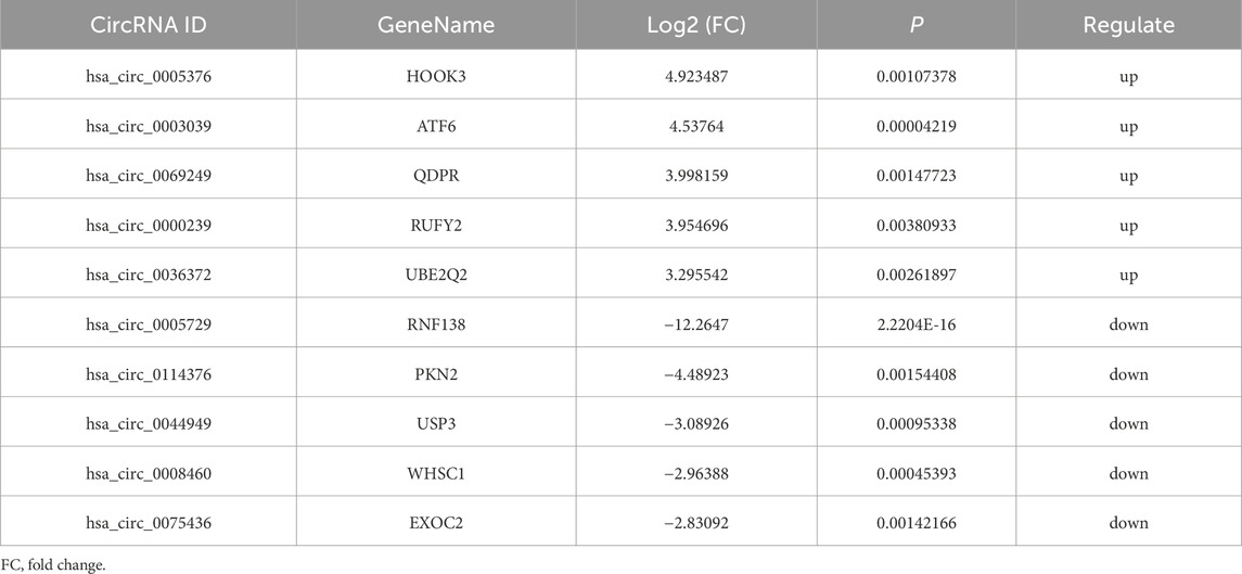 Based on W. HTSeq results and applying the criteria of fold change (FC) ≥ 1.5 and P < 0.05, a total of 91 DECs were identified, including 64 upregulated and 27 downregulated circRNAs (Figures 2A,B). The majority of these circRNAs were derived from exonic regions and distributed across multiple chromosomes (Figures 2C,D). The top 10 DECs, ranked by log2 FC, are presented in Table 1 along with their corresponding P-values.