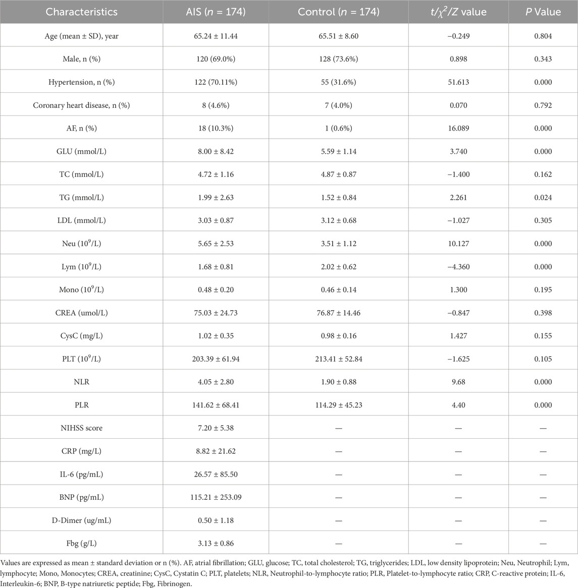 Healthy controls were recruited from individuals undergoing routine health examinations. They had no history of cerebrovascular events or major neurological disorders and were matched to AIS patients by age and sex.