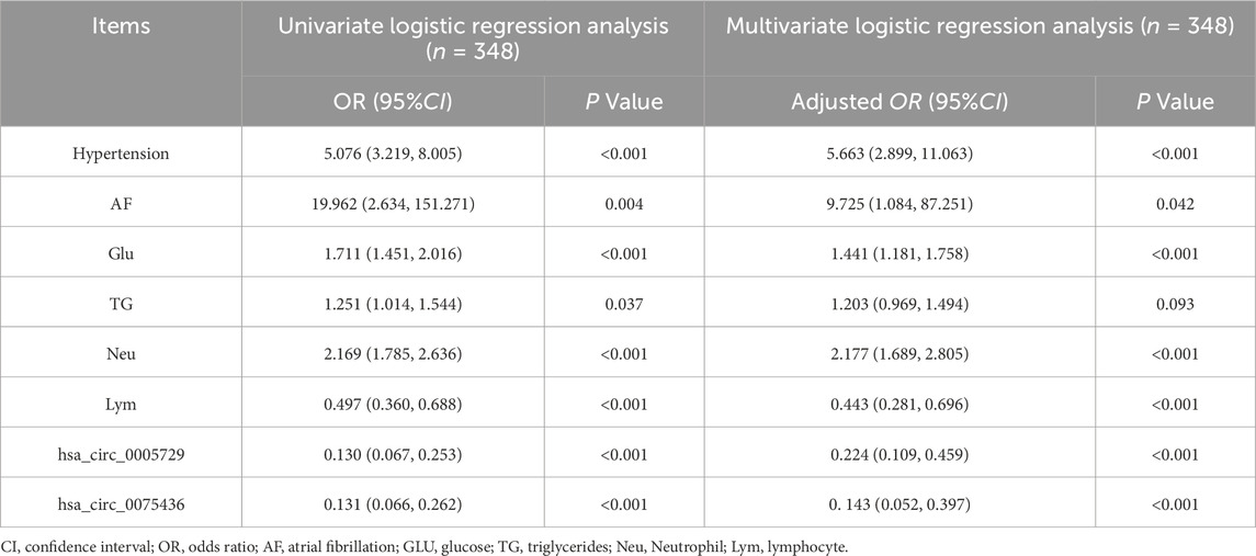 Univariate and multivariate logistic regression analyses were performed on the combined cohort (n = 348) to identify independent risk factors associated with AIS (Table 3). Univariate logistic regression analysis identified several variables significantly associated with AIS: hypertension (OR = 5.076, 95%CI = 3.219 to 8.005, P < 0.001), atrial fibrillation (OR = 19.962, 95%CI = 2.634 to 151.271, P = 0.004), elevated blood glucose (OR = 1.711, 95%CI = 1.451 to 2.016, P < 0.001), elevated triglycerides (OR = 1.251, 95%CI = 1.014 to 1.544, P = 0.037), increased neutrophil counts (OR = 2.169, 95%CI = 1.785 to 2.636, P < 0.001), decreased lymphocyte counts (OR = 0.497, 95%CI = 0.360 to 0.688, P < 0.001), and reduced expression of hsa_circ_0005729 (OR = 0.130, 95%CI = 0.067 to 0.253, P < 0.001) and hsa_circ_0075436 (OR = 0.131, 95%CI = 0.066 to 0.262, P < 0.001). Multivariate logistic regression further confirmed that hypertension (OR = 5.663, 95%CI = 2.899–11.063), atrial fibrillation (OR = 9.725, 95%CI = 1.084–87.251), elevated blood glucose (OR = 1.441, 95%CI = 1.181–1.758), increased neutrophil counts (OR = 2.177, 95%CI = 1.689–2.805), decreased lymphocyte counts (OR = 0.443, 95%CI = 0.281–0.696), and reduced levels of hsa_circ_0005729 (OR = 0.224, 95%CI = 0.109–0.459) and hsa_circ_0075436 (OR = 0.143, 95%CI = 0.052–0.397) were independent risk factors for AIS (all P < 0.001, except atrial fibrillation, P = 0.042). Triglyceride levels were not significant in the multivariate model (P = 0.093).