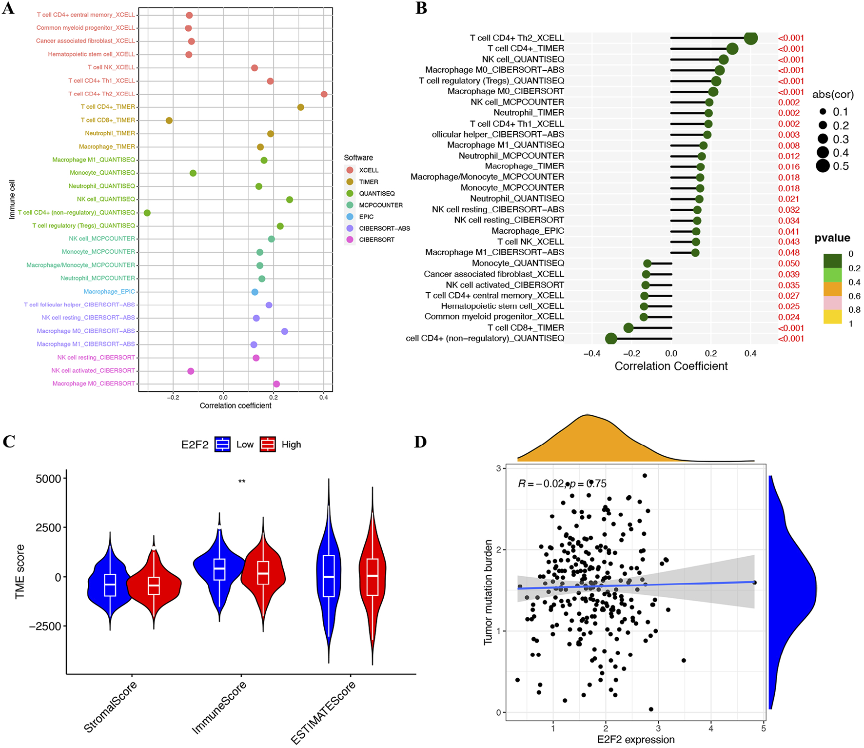 The tumor microenvironment (TME) is composed of tumor cells, extracellular matrix (ECM), related stromal and immune cells, and signaling substances (Yang, 2017). We calculated the stromal, immune, and ESTIMATE scores of E2F2 by applying the ESTIMATE algorithm (Yoshihara et al., 2013). This algorithm facilitated a breakdown of the E2F2 scores related to the different cellular components of the TME, highlighting the scores associated with stromal cells, immune cells, and the overall ESTIMATE score, which reflects the relative abundance of stromal and immune cells in the TME. After estimating the infiltration of immune cells, we carried out Spearman correlation analysis. This assessed the connection between E2F2 expression and immune cell quantity, making use of seven immune-related databases: xCell, TIMER, quanTIseq, MCPcounter, EPiC, CIBERSORT-ABS, and CIBERSORT. Additionally, Spearman correlation analysis was performed to explore the link between E2F2 expression and immune checkpoints. To display the results, we utilized the “corrplot” R package.