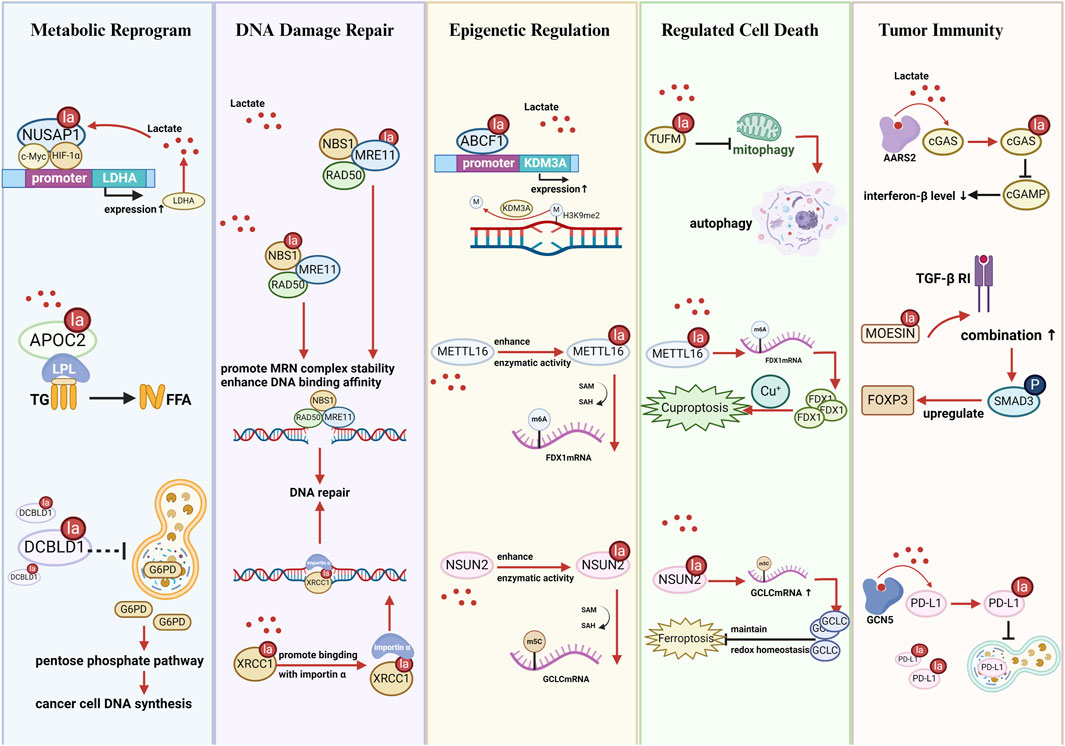 These findings highlight the functions of nonhistone lactylation in promoting cancer progression and metastasis while occasionally inducing cell death under specific conditions. Further studies on these mechanisms may provide novel therapeutic targets for cancer.
