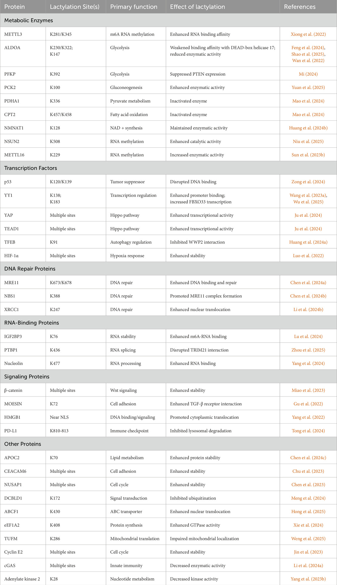 The initial studies focused on histone lactylation (Zhang et al., 2019; Yu et al., 2021; Zhang et al., 2024; Pan et al., 2022; Fan H. et al., 2023; Li et al., 2020; Sun et al., 2022); however, nonhistone lactylation far exceeds histone lactylation within cells in terms of variety and abundance (Sun et al., 2022). Hence, nonhistone lactylation may exert more profound effects on cellular function regulation than histone lactation. The targets of nonhistone lactylation include metabolic enzymes (Xiong et al., 2022), transcription factors (Wang X. et al., 2023), and DNA repair proteins (Chen Y. et al., 2024). By interacting with cancer-related genes and pathways, these lactylated proteins participate in crucial biological processes such as cancer cell metabolic regulation (Lu et al., 2024; Chen et al., 2025a; He et al., 2024), tumor immune microenvironment modulation (Ye et al., 2022; Dai et al., 2024; Gu et al., 2022; Yang H. et al., 2023), DNA repair (Chen Y. et al., 2024; Chen H. et al., 2024; Zong et al., 2024), and cellular autophagy (Sun W. et al., 2023; Jia et al., 2023; Meng et al., 2024; Huang Y. et al., 2024), influencing tumor development and treatment response (Xiong et al., 2022; Wang X. et al., 2023; Chen Y. et al., 2024; Lu et al., 2024; Gu et al., 2022; Yang H. et al., 2023; Chen H. et al., 2024).