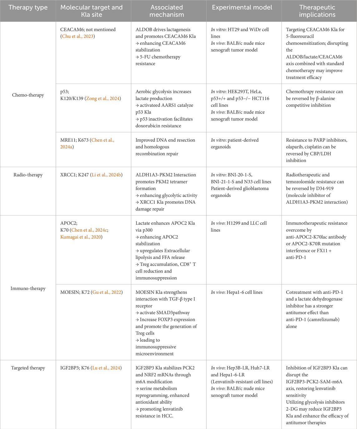 Multiple studies have proved that nonhistone lactylation significantly influences tumor sensitivity to various therapeutic approaches (Table 2).