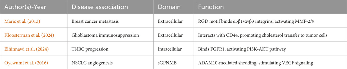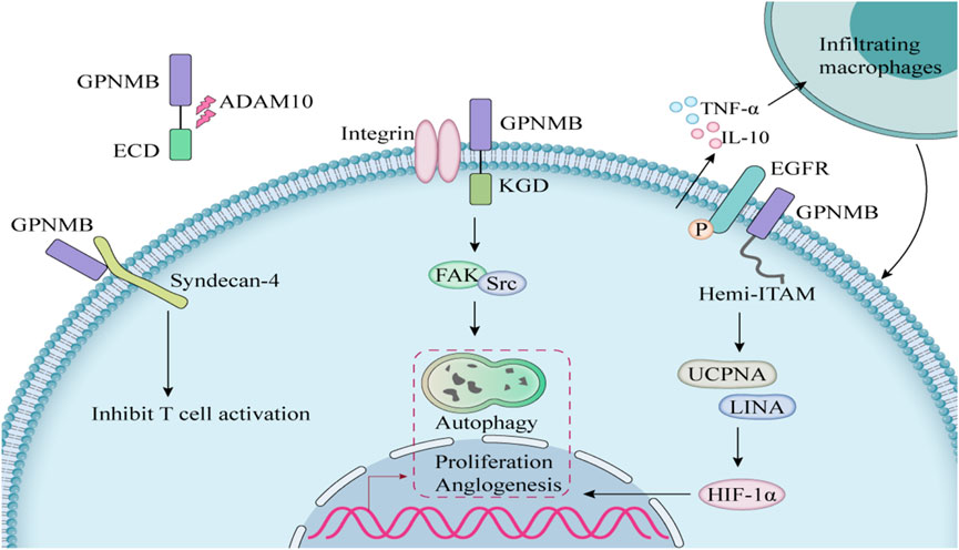 GPNMB is a structurally complex type I transmembrane glycoprotein with diverse physiological and pathological functions mediated through three critical domains (Table 1). The extracellular domain (ECD) harbors an evolutionarily conserved RGD motif (position 452-454) that binds α5β1/αvβ3 integrins (Cancer Genome Atlas Research Network, 2014), facilitating metastatic dissemination in breast and prostate cancer models (Fiorentini et al., 2014). The intracellular domain (ICD) contains a hemITAM motif that recruits SYK kinases, activating pro-survival PI3K/Akt/mTOR and MEK/ERK pathways in glioblastoma (Bao et al., 2016). ADAM10/17-mediated ectodomain shedding generates sGPNMB (Xie et al., 2019), and this sGPNMB promotes angiogenesis by inducing VEGFR2 phosphorylation (Rose et al., 2010) (Figure 1).