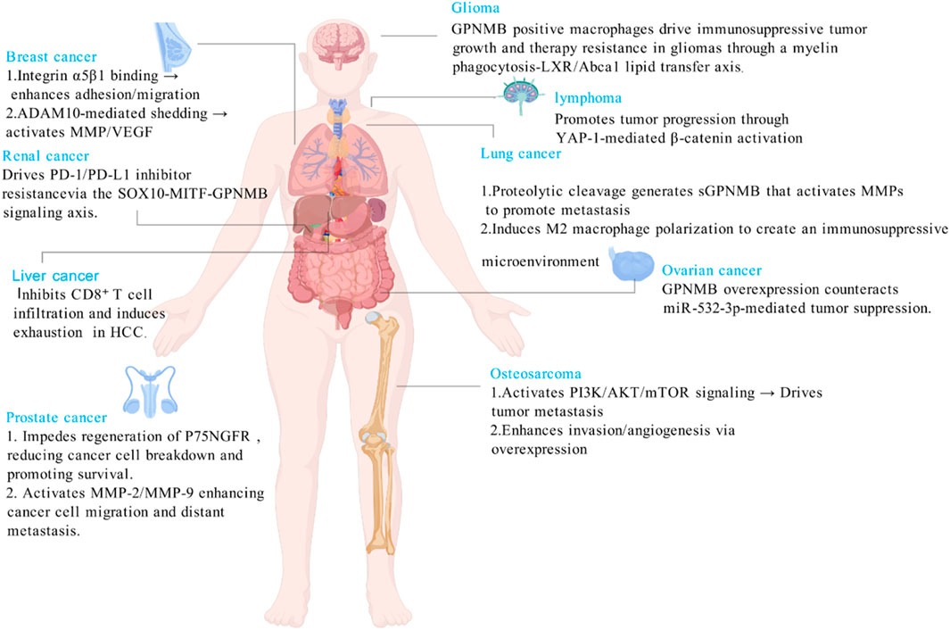Progress Compared to normal tissues, GPNMB is expressed at higher levels in cancer tissues. Its normal physiological functions include anti-inflammatory effects, neuroprotection, and involvement in melanosome synthesis. However, in tumor tissues, GPNMB can promote the growth, proliferation, and metastatic invasion of various cancer cells, as well as enhance angiogenesis in the surrounding tumor environment. Consequently, GPNMB has emerged as a potential therapeutic target for multiple cancers, including melanoma, breast cancer, and osteosarcoma.