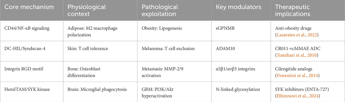 GPNMB originally identified in melanoma in 1995 (Hoashi et al., 2010), has been recognized as a pleiotropic regulator modulating both physiological homeostasis and disease pathogenesis through its multidomain structure containing an RGD integrin-binding motif, PKD domain, and hemITAM signaling motif (Theos et al., 2013). While essential for melanosome formation and wound healing under physiological conditions, GPNMB is aberrantly overexpressed and functionally co-opted in multiple pathologies (Taya and Hammes, 2018). In oncology, GPNMB overexpression drives malignant progression through three well-characterized mechanisms: (1) immunosuppression via DC-HIL/Syndecan-4-mediated CD8+T-cell exclusion (Xiong et al., 2022). (2) metabolic dysregulation through hepatocyte-secreted sGPNMB in obesity-associated cancers (Gibbons et al., 2022). (3) therapeutic resistance consequent to ADAM10/17-mediated ectodomain shedding (Ott et al., 2014). Notably, domain conservation enables GPNMB to orchestrate parallel pathogenic cascades-activating PI3K/Akt in malignancies while disrupting microglial function in neurodegeneration through shared hemITAM interactions (Diaz-Ortiz et al., 2022). This context-dependent functionality, regulated by cell-type-specific post-translational modifications, establishes GPNMB as a molecular switch governing the balance between tissue maintenance and disease pathogenesis.