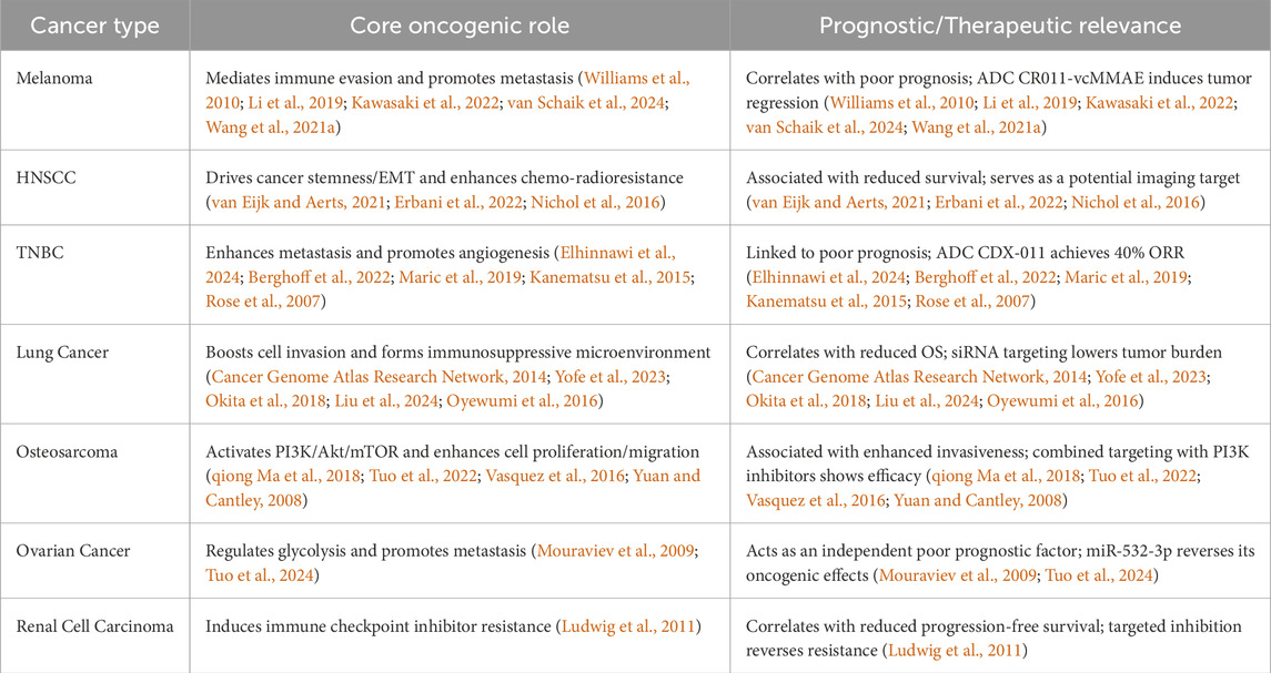 GPNMB has transformed from an initially identified tumor suppressor to a key oncogenic driver. Unlike its role in maintaining homeostasis in non-tumor diseases, GPNMB mediates immune suppression by promoting the polarization of tumor-associated macrophages toward the M2 phenotype and metastatic colonization by enhancing tumor cell metabolism and invasive capacity through aberrant activation of common pathways such as CD44/NF-κB and mTORC1 in tumors (Lazaratos et al., 2022). It promotes malignant progression in various cancers including breast cancer and head and neck squamous cell carcinoma by enhancing proliferation, invasion, metastasis, and inducing EMT and stemness. Its overexpression correlates with poor prognosis, making it a promising pan-cancer therapeutic target (Figure 3).
