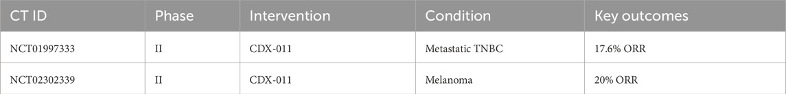 Targeting GPNMB has yielded promising yet complex outcomes. Antibody-Drug Conjugates (ADCs): CDX-011 (Glembatumumab vedotin), an ADC linking an anti-GPNMB antibody to the cytotoxic agent MMAE, achieved a 17.6% objective response rate in GPNMB-high TNBC patients. However, dose-limiting toxicities like neuropathy and rash highlight the challenge of balancing efficacy and safety (Wang et al., 2021a). CR011-vcMMAE, another ADC, induced complete regression in melanoma xenografts but faces resistance due to sGPNMB shedding, which neutralizes the drug before it reaches tumors (Vaklavas and Forero, 2014). The Phase I/II NCT04561362 trial demonstrated BT8009 achieved 22.4% ORR with 60% DCR in advanced solid tumors, showing favorable safety and promising efficacy compared to traditional ADCs, particularly in TNBC and urothelial carcinoma, with ongoing dose and cohort optimization. Immune Checkpoint Combinations: Preclinical studies show that blocking GPNMB synergizes with PD-1 inhibitors. In hepatocellular carcinoma, GPNMB blockade restored CD8+ T-cell infiltration and enhanced anti-PD-1 efficacy (Chen et al., 2024). Small Molecule Inhibitors: mTOR inhibitors like rapamycin indirectly suppress GPNMB in lymphangioleiomyomatosis (LAM), reducing tumor growth by 60% in murine models (Gibbons et al., 2024). Emerging Technologies: CRISPR-Cas9 editing of GPNMB in glioblastoma cells reduced invasion by 70%, while nanoparticle-mediated delivery of GPNMB siRNA improved targeting and reduced off-tumor effects in lung cancer models (Tuo et al., 2024). These advances underscore the potential of precision therapies but emphasize the need to address GPNMB’s dual roles in health and disease (Table 5).