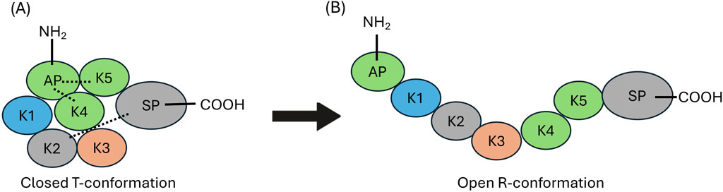 Figure 1. Structural organization of human plasminogen (hPg). (A) The closed (T) conformation of hPg illustrating the interactions between AP, with the K4, and K5 domains, as well the interaction between K2 and the SP domain those of K2 and the SP domain (dotted lines). (B) The open highly activatable relaxed (R) conformation of hPg highlighting the loss of intramolecular interactions that maintain the closed conformation.