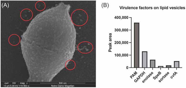 Figure 2. Analysis of Streptococcus pyogenes-AP53 (GAS)-derived MVs. SEM imaging and mass spectrometric analysis of isolated S. pyogenes-AP53 MVs. (A) SEM image of S. pyogenes, confirming the presence of MVs on the surface of S. pyogenes-AP53 cells (red circles). The large spherical structures on the surface of the cell and in the surrounding supernatant are representative of MVs commonly seen on the surface of S. pyogenes. (B) Mass spectrometric analysis of selected proteins found in isolated PL vesicles from of S. pyogenes-AP53. Five relevant GAS virulence factors are listed. These data represent independent experiments using separate MVs and do not differ by more than 15% for each protein.