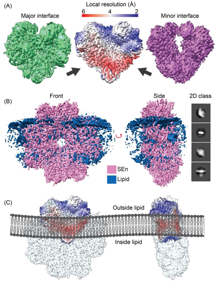 Figure 3. The DOPG/SEn dimer exposed on the DOPG surface. (A) The major interface (green), minor interface (purple), and the combined particle local resolution map (center), with the arrow pointing on the reddish region where PL interacts with the SEn map as shown in (B). (B) Full cryo-EM map of full SEn with phospholipid obtained using a larger box size and C2 symmetry. The 2D class was obtained by extracting particles at 428 pix box size and circular mask diameter of 200 Å. (C) Models of PL/SEn dimers as they exist within the bilayers of the PL-vesicles. Left to right shows the octameric Sen with the major interface dimer exposed on the outside of the bilayer, the octamer of the exposed major interface dimer rotated 90°, and the octameric SEn with the minor interface dimer exposed on the outside of the bilayer.