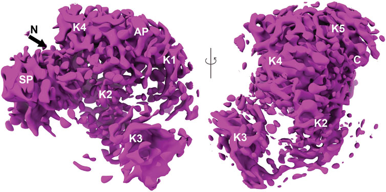 Figure 4. Finalized map and model of hPg bound to DOPG/SEn. The map of hPg bound to SEn on the surface of DOPG particles. Regions containing SEn were removed due to their lower resolution resulting from multiple binding orientations of hPg. The domains of hPg marked on the map show the characteristic kringle (K), activation peptide (AP), and serine protease (SP) domains.
