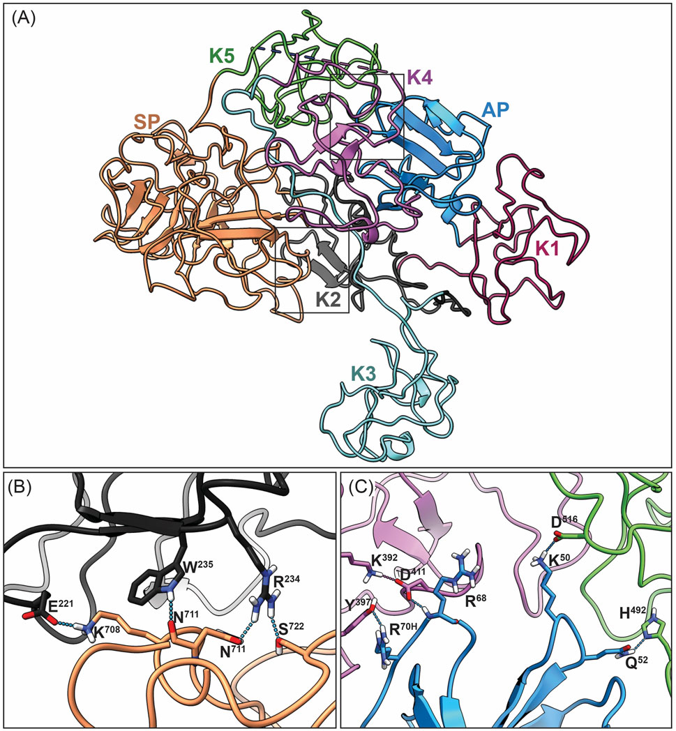 Figure 5. Overall closed conformation model of hPg bound to DOPG/SEn. (A) Overview of the hPg component of the DOPG/SEn/hPg complex with each Kringle domain colored separately: AP (blue), K1 (maroon), K2 (dark gray), K3 (cyan), K4 (purple), K5 (green), and SP (orange). The closed conformation of hPg is shown by the LBS interaction of (B) K2 and SP, and (C) K4, K5, with AP residues within the interior of hPg. In the cryo-EM hPg structure bound to SEn, these residues are close enough to interact with distance <3 Å, suggesting that hPg remains mainly in the closed conformation when bound to SEn.