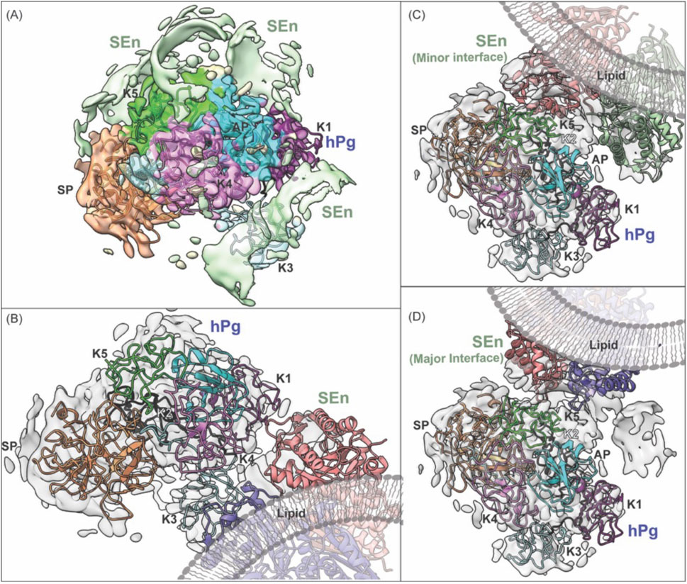 Figure 6. Fitting of SEn into cryo-EM density maps for the hPg-SEn complex in DOPG vesicles. (A) Overview of the full cryo-EM map showing hPg model fitted into its electron density with surrounding segmented densities attributed to SEn subunits shown in light green. (B) Masked hPg map focusing on the interactions of hPg K1 and K4 with SEn major interface. (C) Masked hPg map focusing on the interaction of hPg K5 and SEn minor interface. (D) Masked hPg map focusing on the interaction of hPg K5 and SEn major interface. Both types of interfaces spacing was found on the combined map, suggesting that different orientation of two subunits of SEn are capable of binding to hPg K5 domain. A lipid visualization has been added to enhance understanding.