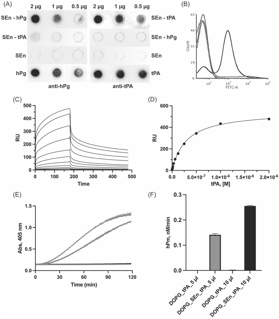 Figure 7. Interaction of tPA with SEn. (A) Dot blots of SEn (2 μg, 1 μg, 0.5 μg) incubated with either (800 nM) hPg or tPA and further incubated with anti-hPg or anti tPA. SEn, hPg, or tPA (2, 1, 0.5 µg) was blotted as a negative or positive control. (B) FACS analysis of tPA interaction with DOPG-SEn-tPA (black), showing a 70% ± 10% shift in the FITC axis, DOPG-SEn (red) is at <1%, DOPG-tPA (blue) is at 7% ± 1%, and DOPG alone (purple) is at <1%. (C) Representative SPR sensorgram for the binding of tPA to SEn. (D) Representative affinity fit between SEn and tPA shown with an average KD of 161 ± 70 nM from six-plicate experiments. (E) Plots of Abs405nm versus time, showing the effects of DOPG-SEn/tPA (5 μL-blue and 10 μL-green) and DOPG-tPA (5 μL-gray and 10 μL-black) on hPg activation. (F) Bar representation of the hPm generated by DOPG-SEn/tPA and DOPG-tPA.