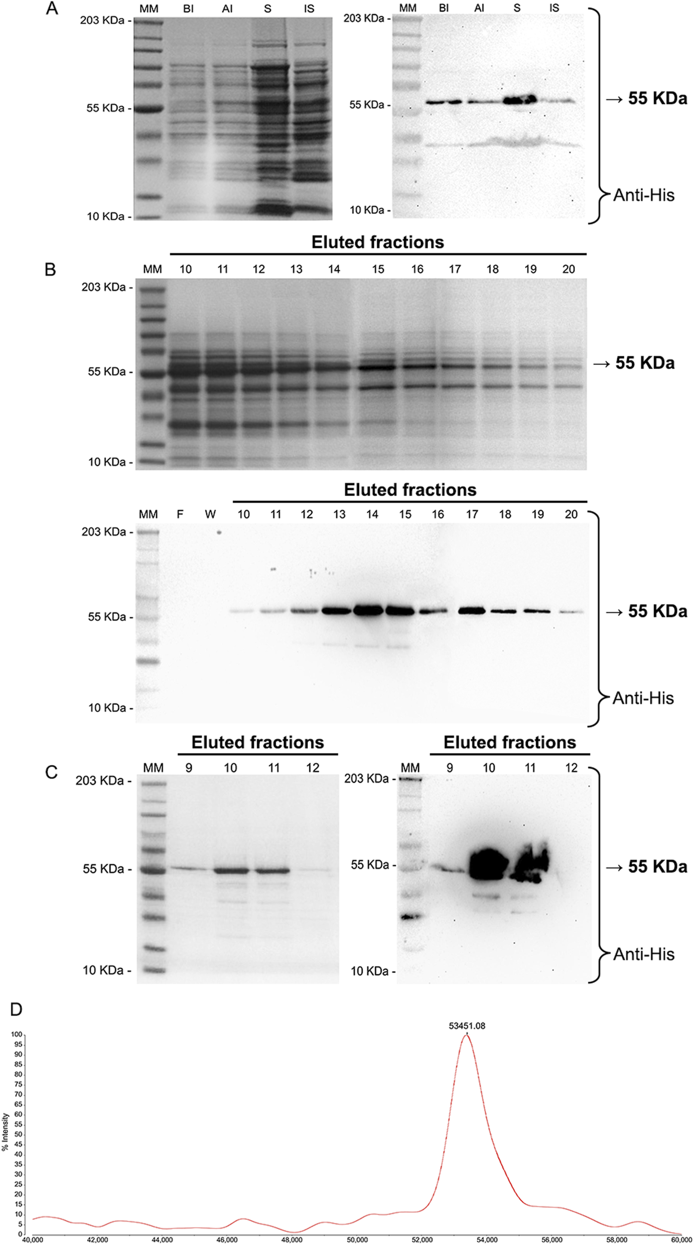 Figure 2. Expression, purification, and validation of recombinant Trypanosoma cruzi N-myristoyltransferase (TcNMT). (A) SDS-PAGE (left) and Western blot (right) showing total expression and solubility of recombinant TcNMT. BI: bacterial lysate before induction; AI: after IPTG induction; S: soluble fraction. A distinct band at 55 kDa corresponds to the expected molecular weight of TcNMT, confirmed by immunodetection using anti-His antibody. (B) Nickel affinity chromatography of the soluble fraction using Ni-NTA resin. Fractions 6–22 were collected and analyzed by SDS-PAGE (top) and Western blot (bottom). The target protein eluted between fractions 11–18 with high purity and strong immunoreactivity at 55 kDa. MM: molecular marker; F: flow-through; W: wash fraction. (C) Anion exchange chromatography showing fractions 9–12 on SDS-PAGE (left) and corresponding Western blot (right). The strongest signal for TcNMT was observed in fractions 10–11, consistent with further enrichment. (D) MALDI-TOF mass spectrometry analysis of the final purified protein. The main peak at 53,451.08 m/z confirms the expected molecular weight of recombinant TcNMT, validating its identity.