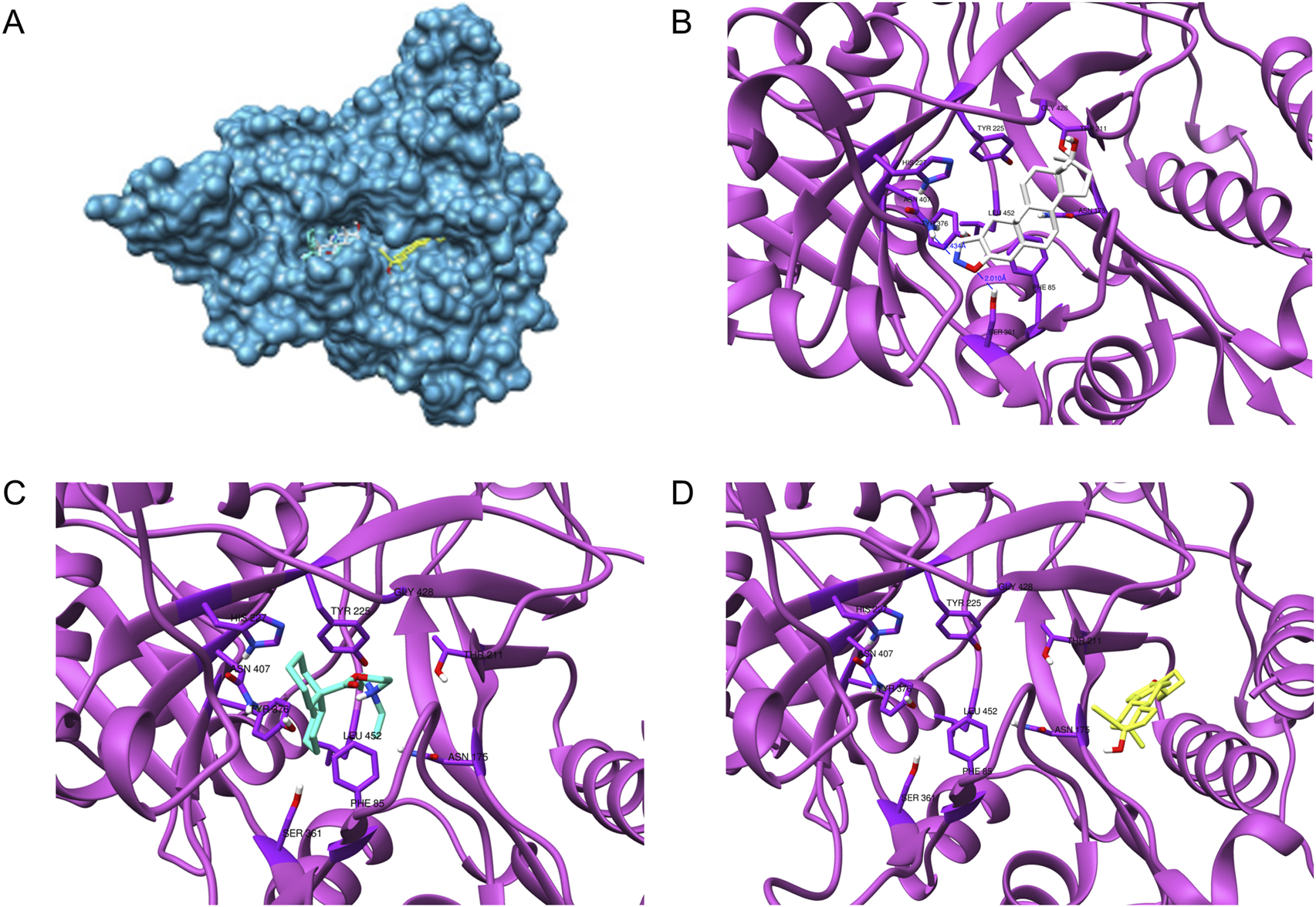 Figure 7. Structural model of Trypanosoma cruzi N-myristoyltransferase (TcNMT) in complex with candidate inhibitors. (A) Overall cartoon representation of TcNMT (magenta), showing the predicted binding poses of the three lead compounds: DANA (white), DICY (cyan), and QUINE (yellow), docked into the active site using AutoDock Vina. (B) Close-up of the DANA binding pose, highlighting hydrogen bond interactions with residues SER361, TYR376, ASN407 (via the nitrogen atom), and ASN429 (via the oxygen atom). DANA also establishes hydrophobic contacts with PHE85, TYR225, PHE240, and LEU430. (C) Predicted binding mode of DICY showing hydrophobic interactions with aromatic residues PHE83, PHE85, PHE240, and TYR225 within the TcNMT binding pocket. (D) Binding pose of QUINE, illustrating extensive hydrophobic interactions with TRP12, VAL76, ILE174, LEU177, ILE193, TYR210, LEU216, and TYR435.