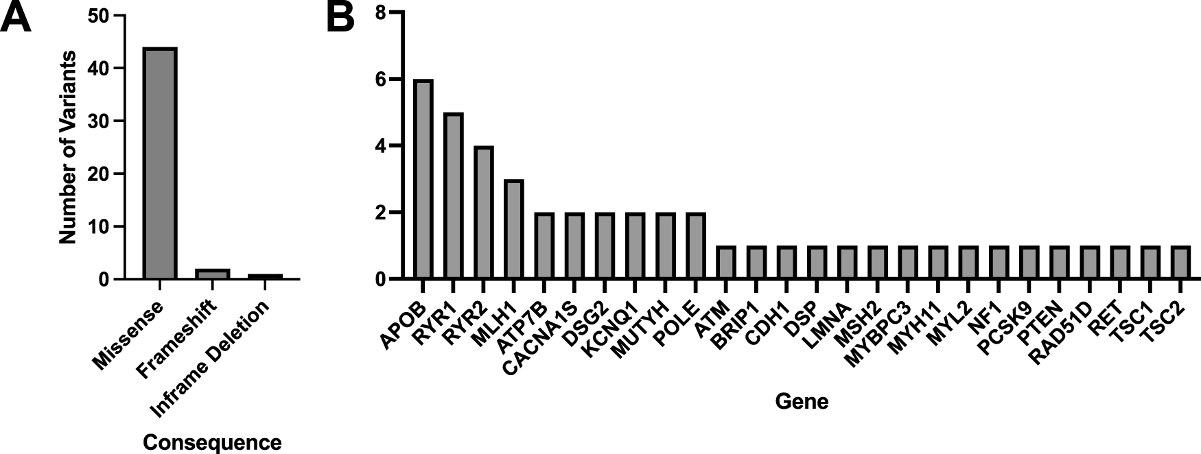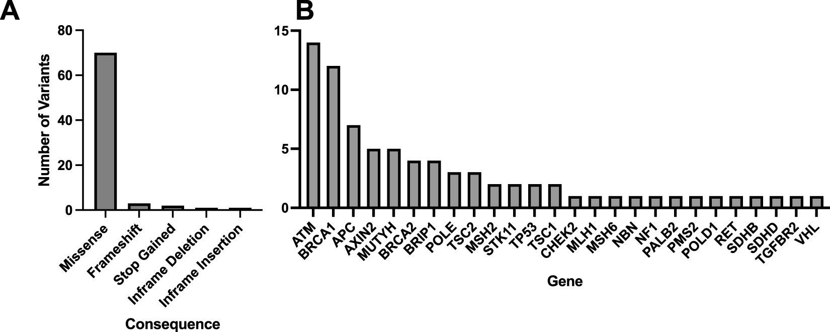 A total of 33 variants identified across 30 patient EHRs were used for comparison to the WGS DRAGEN variant caller (Supplementary Spreadsheet SB). Most identified variants were missense (Figure 3A) and the most frequent gene represented was BRCA1 (Figure 3B).