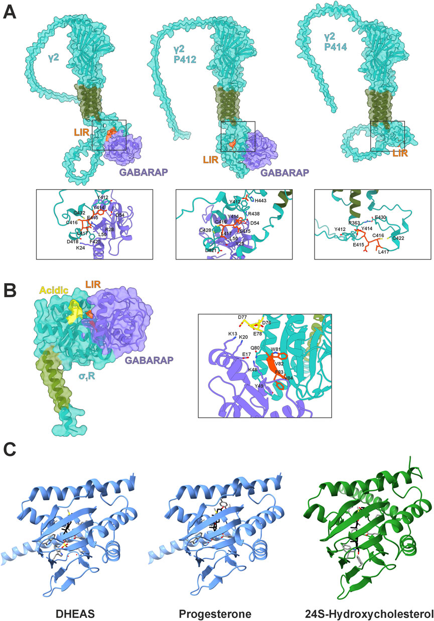 Figure 1. GABARAP interactions and σ1R structural context. (A) AlphaFold3 models of GABARAP (purple) in complex with the GABAA receptor subunit γ2 (teal with green transmembrane domain) with highlighted LIR (orange) in their native states including phosphorylated tyrosines Y412/Y414. (B) AlphaFold3 model of GABARAP (purple) in complex with σ1R (teal with green transmembrane domain), highlighting the LIR domain (orange) and acidic residues (yellow). (C) Crystal structure of Xenopus laevis σ1R (blue) with DHEAS (pdb:8WUE) or progesterone (pdb:8W4C) bound and Boltz-2 predicted interaction of Homo sapiens σ1R (green) with 24S-hydroxycholesterol.