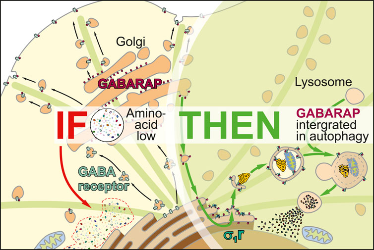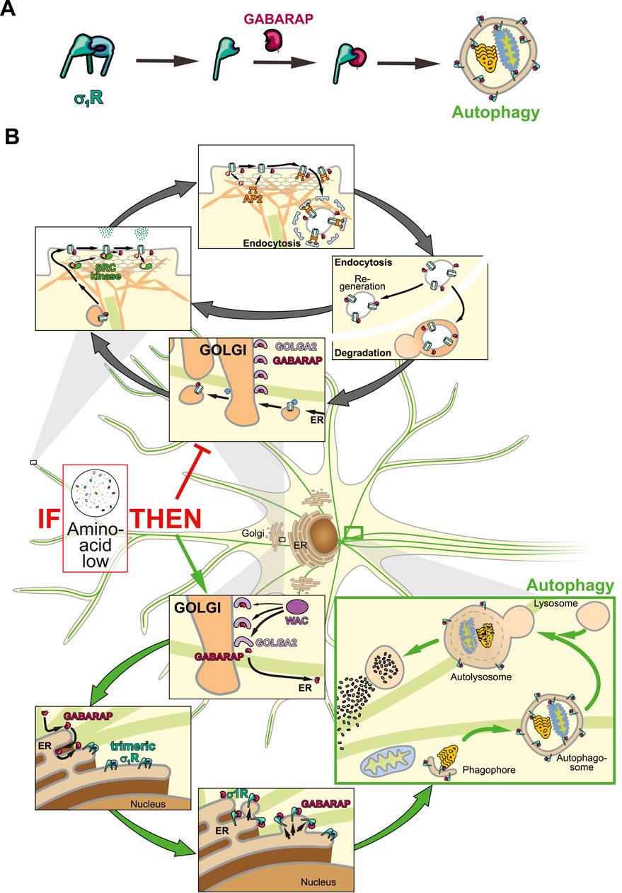 Figure 2. Schematic illustration of neuronal GABARAP logistics. (A) Step by step illustration of σ1R activation leading to autophagosome-associated GABARAP. (B) GABARAP is stored at the Golgi and either mediates receptor transport or integrates into autophagy via σ1R.