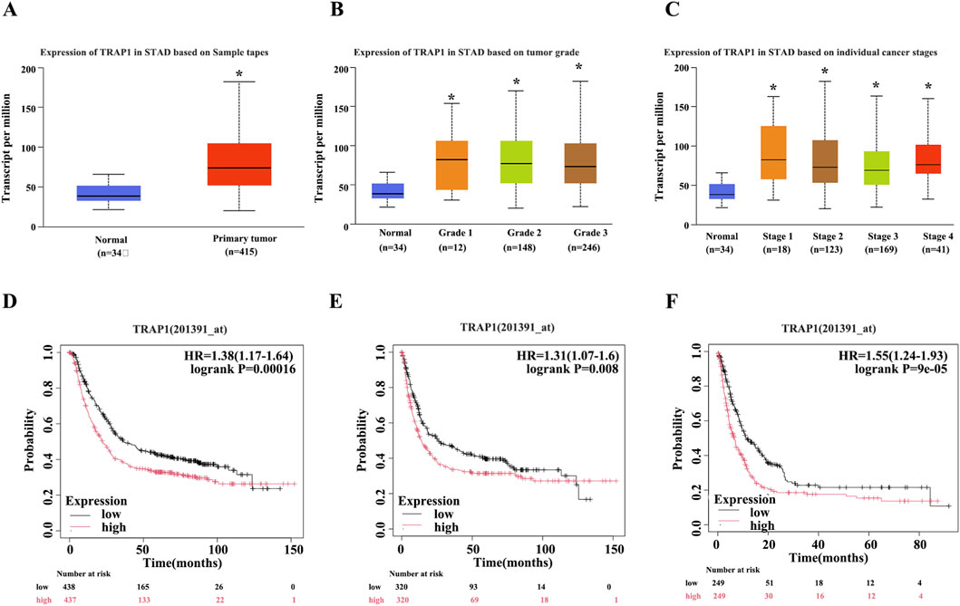 Figure 1. TRAP1 was upregulated in GC tissues and related with adverse prognosis for GC patients. (A) TRAP1 was significantly upregulated in GC tissues. (B,C) TRAP1 expression was independent of clinicopathological characteristics including tumor stage (B) and differentiation grade (C) in GC patients. (D–F) Kaplan-Meier survival curves of OS (D), FP (E), and PPS (F) in GC patients. OS: overall survival, FP: survival to first progression, PPS: post progression overall survival; *: P < 0.05; **: P < 0.01; ***: P < 0.001 compared with normal gastric tissue.