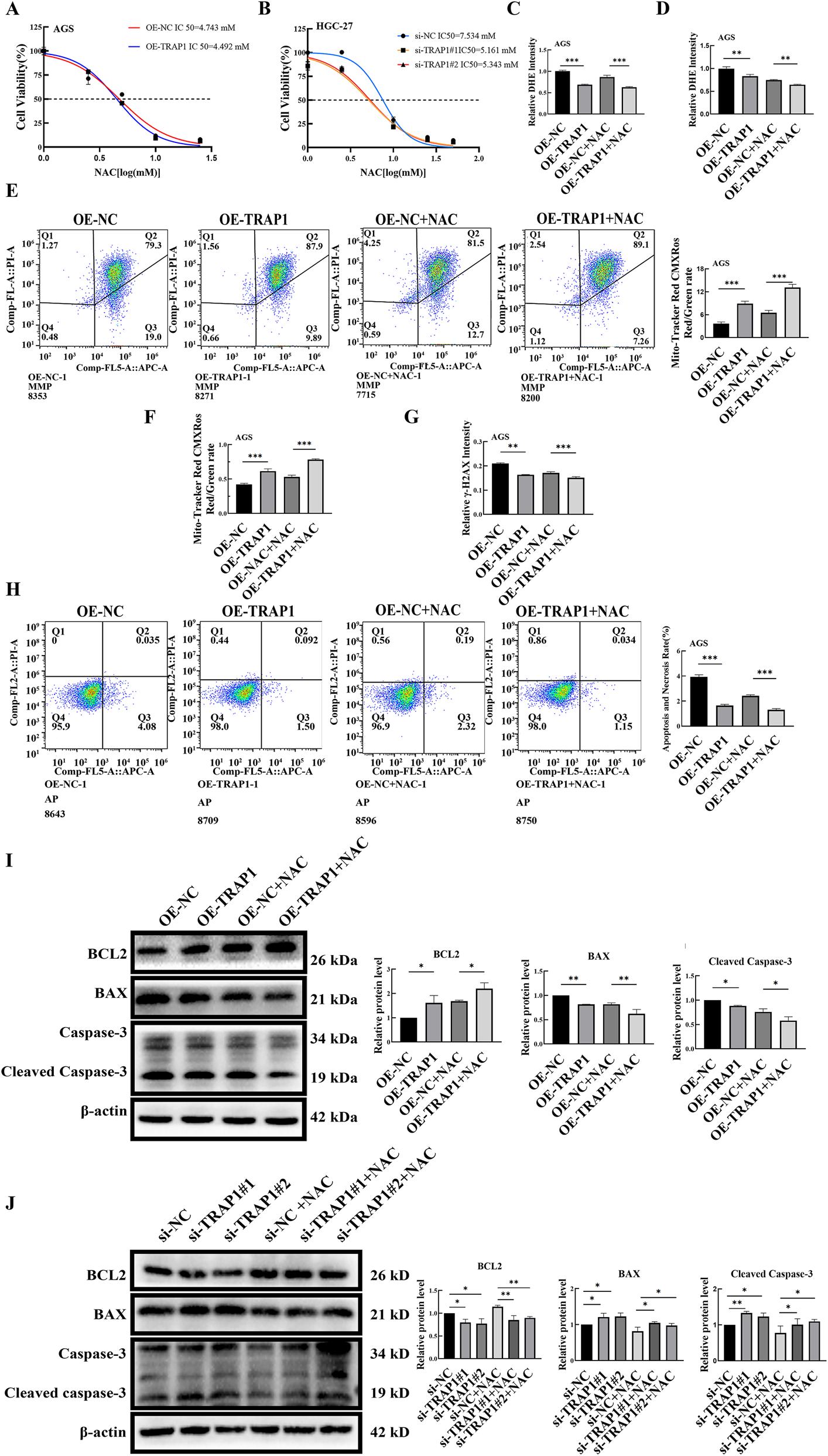 The combination of TRAP1 and NAC inhibits the accumulation of ROS and cell death in GC cells. (A,B) Cell viability under NAC treatment in TRAP1 over-expressed AGS cells and TRAP1 silenced HGC-27 cells. (C,D) The combined use of TRAP1 and NAC further attenuated DHE fluorescence staining and detected by FCM in AGS cells. (E,F) In AGS cells co-treated with TRAP1 and NAC, MMP was labeled using Mito-Tracker Red CMXRos and analyzed by FCM. (G) Combination of NAC and TRAP1 reduced the level of DNA damage marker γ-H2AX in GC cells. (H) Combination of TRAP1 and NAC inhibited cell death in GC cells. (I,J) Protein expressions following NAC treatment in AGS and HGC-27 cells. NC: negative control; OE: over expression; Si:silence. *: P < 0.05; **: P < 0.01; ***: P < 0.001 vs. control.