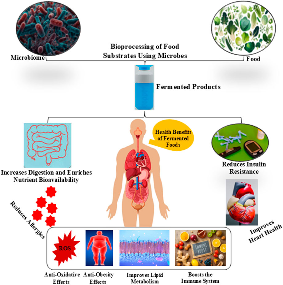 These types of phenolic acids play a vital part in the deterrence and management of chronic illnesses like oxidative stress due to their scavenging activity of reactive oxygen species (ROS) and modulate cell signalling pathways. Although natural phenol-based substances have better antioxidant activities, it will be a challenging task to utilize them because of their bioavailability. Moreover, phenolic acids are less frequently absorbed in the gastrointestinal tract due to their high molecular size and low water solubility when disbursed in their natural state. The gut microbes and enzymes present in the intestine metabolize a huge variety of phenolic substances, by altering their biological activity and lowering their efficacy (De Almeida et al., 2022). The absorption and liberation of biologically active substances may be further incumbered through the existence of dietary fibers, cell walls, and other food matrix elements. Due to this property, only a minor portion of phenolic acid is consumed into the systemic-based circulation. Numerous methods have been determined to enhance the bioavailability of phenolic acids, like fermentation, processing of food, and encapsulation. Fermentation is particularly well-known for its capability to break down complex chemicals and yield them in a more accessible form. To exploit phenolics’ therapeutic potential in the deterrence and treatment of chronic disorders, though, a study is still undergoing to enhance their bioavailability (Das et al., 2023). A study showed that fermented foods like sourdough, tempeh, and fermented cereals have better concentrations of active phenolic acids than their unfermented foods (Dissanayake et al., 2025). Consequently, fermentation plays a significant part in optimizing the therapeutic potential of dietary phenolics, especially in treating oxidative stress and managing chronic diseases, in addition to preserving and improving the nutritional content of foods. Our review work aims to evaluate how fermented foods high in phenolic acid can reduce oxidative stress and how they might be utilized to prevent and treat chronic illnesses.