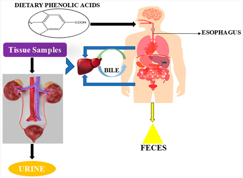Flavonoids and non-flavonoids are the two primary categories of polyphenols, according to Abbas’ research. These groups encompass several subclasses, including stilbenes, phenolic acids, and tannins. These molecules’ chemical and structural makeup determines their bioactive qualities, which include antioxidant and antibacterial capabilities. Furthermore, numerous reported bioactive properties are believed to be beneficial for human health (Abbas et al., 2017). As a result, the attributes of phenolic compounds render them effective agents for the preservation and protection of plant cells against oxidative stress. While tannins and stilbenes play significant roles in defending against microbes and extending the shelf life of plant-derived products, phenolic acids offer protective benefits against pathogens and free radicals. Figure 2 exemplifies the general metabolic pathways of dietary phenolic acids. The excretory system eliminates the waste products from the metabolism of phenolic acids, mostly in urine and feces (Teshome et al., 2022).