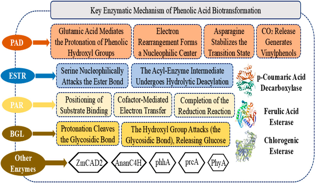 Using biotechnological methods such as enzymatic catalysis and microbial fermentation, phenolic acids are precisely bio-transformed into bioactive derivatives with enhanced antioxidant activity. This process provides a scientific foundation for the development of functional foods and nutraceuticals. In contrast to enzymatic methods, the elucidation of microbial metabolic pathways for phenolic acids has enabled the identification and functional characterisation of significant enzymes. By removing necessary enzymes from microorganisms and improving their catalytic activity, researchers avoid the challenges of microbial cultivation and enable direct and efficient phenolic acid biotransformation (Wang et al., 2024). Furthermore, technical advancements have sped up the development of enzymatic strategies, as demonstrated by enzyme engineering and immobilization techniques that significantly improve catalytic efficiency and operational stability.