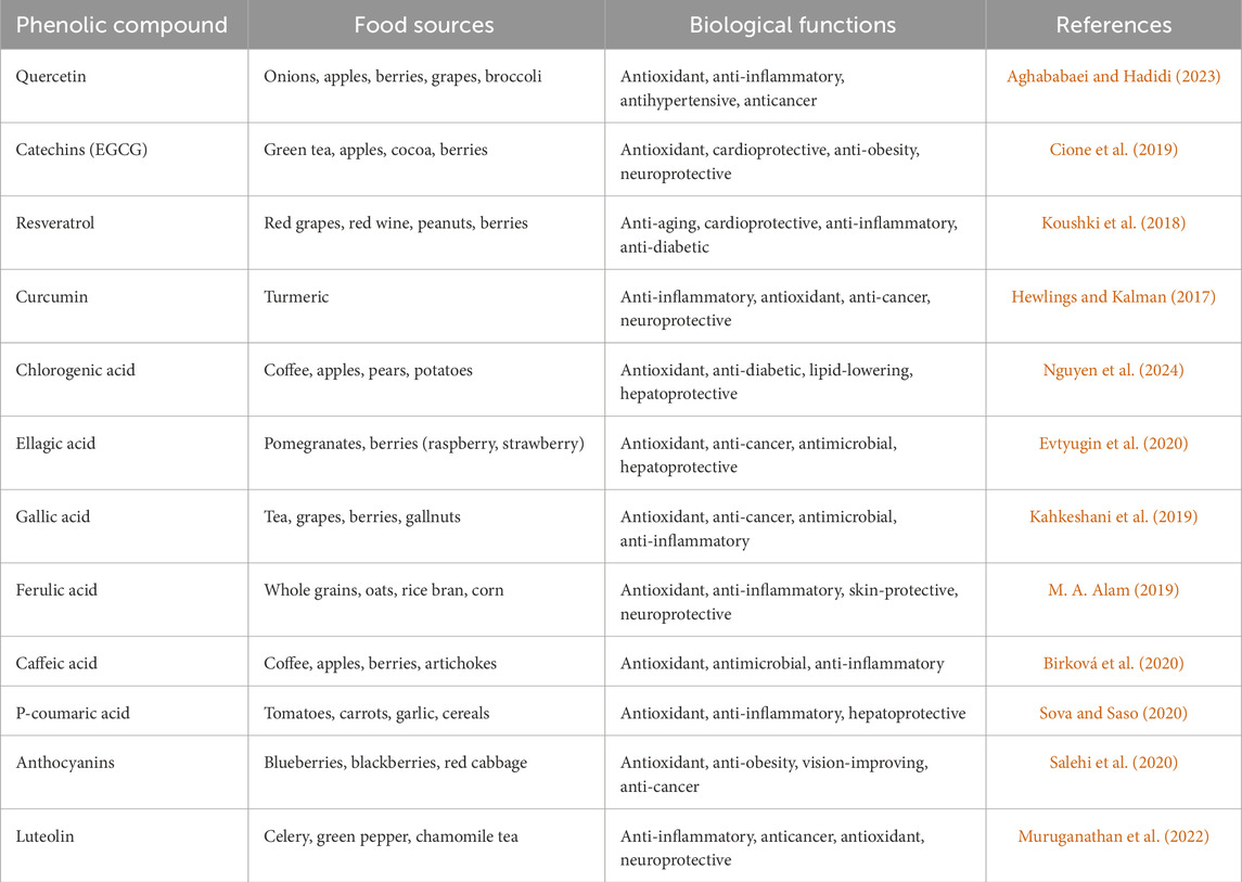 According to Abbas study, phenolic compounds can be further divided into simple phenols, which have a single phenol unit, and polyphenols, which have several connected phenol units. Because of their high phenyl benzopyran content and phenillen-ene-stilbeni structure, which is shaped like this: walks of the basis of two adjacent aromatic rings (rings A and B) with the connection pyran-ring (C6-C3-C6 core structure), and because of the structural molecular between their members that occurs in quantity with a heterocyclic pyran, flavonoids are characterized as highly reactive (Abbas et al., 2017). They are bioactive due to the hydroxyl and methoxyl groups in their structure. While anthocyanins are naturally occurring pigments that are sensitive to pH and help with food preservation and coloring, flavonoids, such as quercetin, are recognized for their antioxidant stability. The recognized family of flavonoids, condensed tannins (also known as proanthocyanidins), includes polymeric phenolic compounds as well. These molecules have astringent effects but may help stabilize food systems. Many people use these subclasses of flavonoids as natural colors, stabilizers, and antioxidants. Non-flavonoid components such as phenolic acids, stilbenes, lignans, coumarins, hydrolyzable tannins, quinones, curcuminoids, and xanthones are important for food preservation and quality (Chiorcea-Paquim et al., 2020). For example, they include phenolic acids, which are found in many fruits and grains and have a C6-C1 structure, and hydrolyzable tannins, which are generated from phenolic acids and have a more complex structure (Goławska et al., 2023). They can be used for oils, beverages, and processed foods, which aligns with the sustainability trend and consumer demand for less expensive, healthier products without additives (Rana et al., 2022). Flavonol, flavone, anthocyanin, and other members of the flavonoid class are well-known for their antioxidant qualities and ability to affect color. Additionally, phenolic acids, tannins, and stilbenes are among the several other non-flavonoids that enhance the food’s durability and sensory quality. In addition to identifying socioeconomic problems, the usage of phenolic compounds and other projections towards food also serves as an enhanced bioactive compound with supplementary advantages and provides a commercial benefit (Table 1).