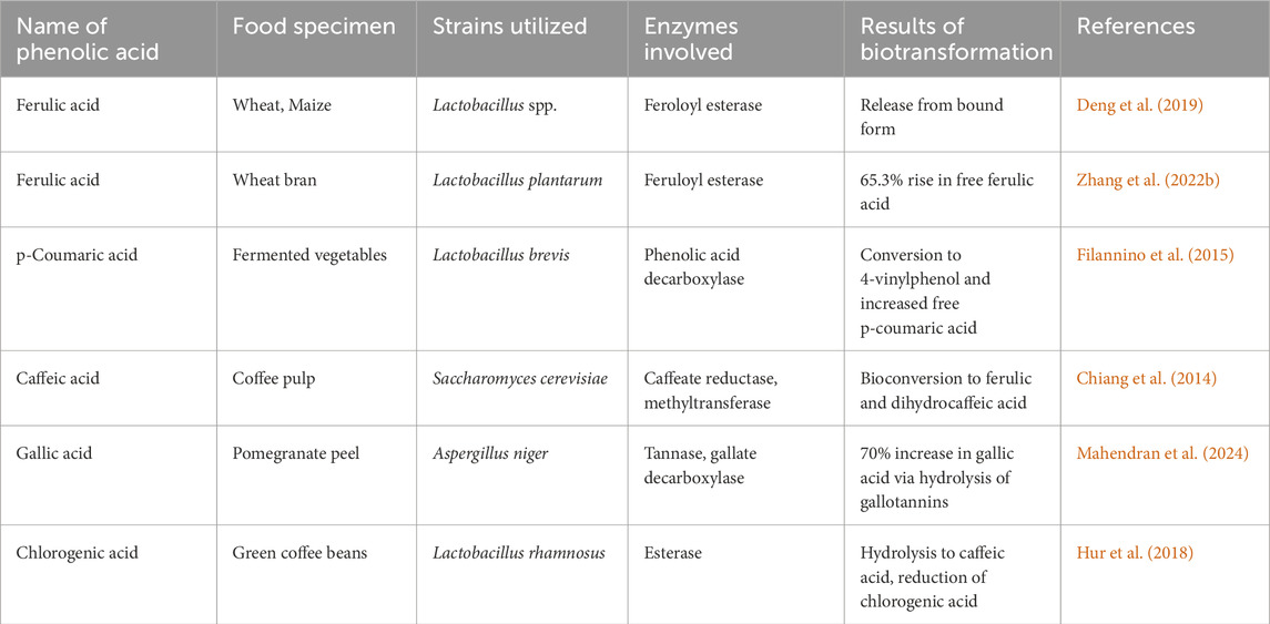 Due to benefits such as mild reaction conditions and excellent substrate specificity, biotransformation technologies have emerged as a crucial method for the targeted structural alteration of phenolic acids and the creation of high-value derivatives. The bulk of phenolic acid synthesis techniques currently in use are chemical, microbiological, and enzymatic; nevertheless, microbial and enzymatic methods have garnered more attention in research due to concerns about food safety (Tembeni et al., 2024; Cao et al., 2025). Phenolic acids obtained from plant biomass and agro-industrial waste can undergo various microbial and enzymatic transformations, resulting in products that are both nutritionally and industrially valuable. Major pathways include decarboxylation, which produces hydroxy-styrene derivatives, amination, yielding compounds like vanillylamine, and ferulic acid degradation, resulting in vanillin and cis,cis-muconic acid. Furthermore, esterification, hydroxylation, halogenation, and acid/aldehyde reduction lead to derivatives such as phenolic esters, 3-hydroxytyrosol, and halide conjugates. Microbial degradation of aromatics and the design of synthetic pathways also allow for the conversion of phenolic acids into organic acids (succinic and lactic) and biofuels (Lu et al., 2025; Tinikul et al., 2018). Bacterial techniques primarily utilise the metabolic capacities of microorganisms to biotransform phenolic acids into useful chemicals. Aspergillus niger, Lactobacillus species, and Saccharomyces yeasts are among the several microbiological taxa that have the ability to biotransform into phenolic acids. For example, following the fermentation of wheatgrass juice, Saccharomyces cerevisiae and Pediococcus acidilactici BD16 facilitated the biotransformation of phenolic acid, greatly improving the nutritional and functional properties of the juice (Akpabli-Tsigbe et al., 2023).