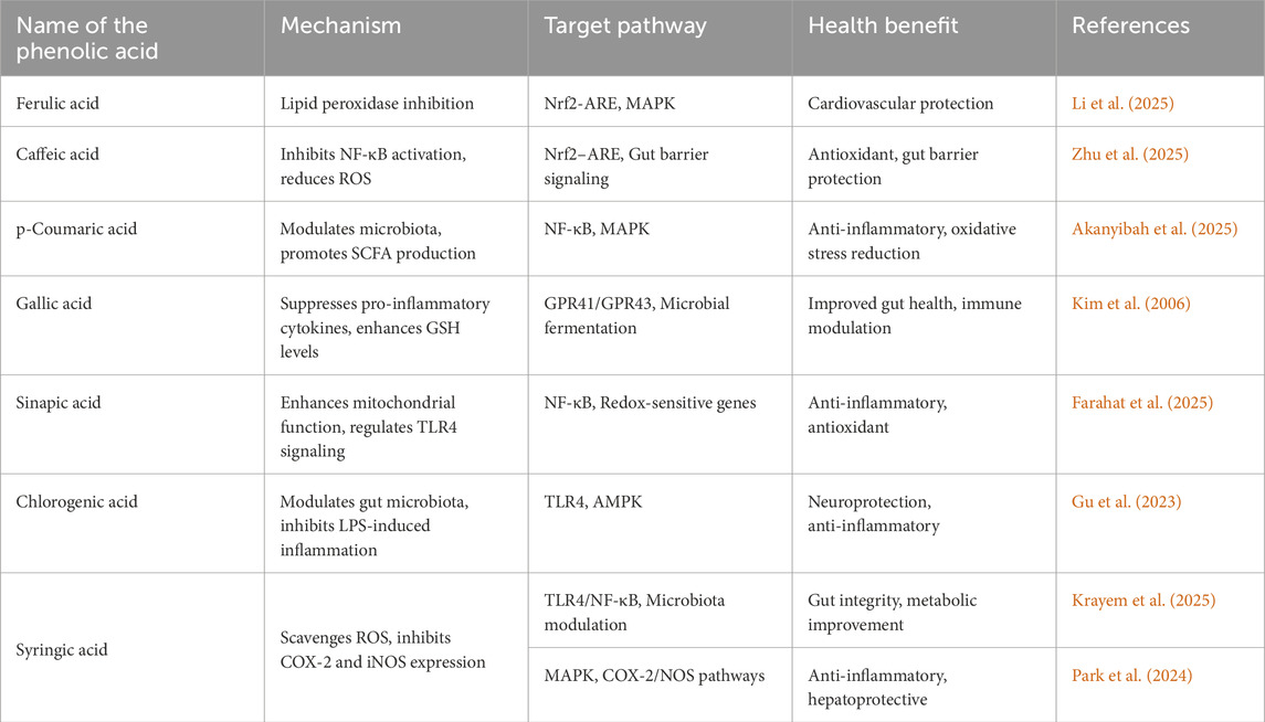 The gut barrier serves as a selective physical and immunological barrier that permits the absorption of nutrients while shielding the host from dangerous microorganisms. Tight junction (TJ) proteins, such as occludin, claudins, and zonula occludens (ZO-1), maintain its integrity. Increased intestinal permeability, sometimes referred to as “leaky gut,” can result from oxidative stress or inflammation that compromises this barrier. This condition is associated with a number of gastrointestinal and systemic conditions. Through a variety of methods, phenolic acids and other bioactive substances can strengthen the intestinal barrier (Saleh et al., 2021). By blocking pro-inflammatory mediators like TNF-α and IL-1β and activating signaling pathways like AMPK, they increase the expression of tight junction proteins. Additionally, they boost the expression of redox-sensitive genes controlled by the Nrf2-ARE pathway, which raises the synthesis of antioxidant enzymes like catalase (CAT), glutathione peroxidase (GPx), and superoxide dismutase (SOD) (Table 3). By lowering intracellular ROS levels, these enzymes help shield intestinal epithelial cells from oxidative injury. Furthermore, bioactive substances influence metabolites produced by microorganisms (such as SCFAs), which can activate GPR43/109A receptors, promoting anti-inflammatory reactions and supporting the preservation of epithelial barrier function (Guo et al., 2024). To sum up, these activities are critical for preventing intestinal dysfunctions and chronic diseases because they preserve gut integrity, lower inflammation, and maintain redox equilibrium.