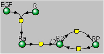 Figure 1. Visual representation of a reaction network created in Virtual Cell (VCell). Ligand EGF binds receptor R (EGFR) forming the complex Ra (EGF-bound EGFR), which subsequently dimerizes to produce R2 (dimeric EGFR complex). This dimer then undergoes phosphorylation, resulting in the fully phosphorylated receptor dimer, RP.