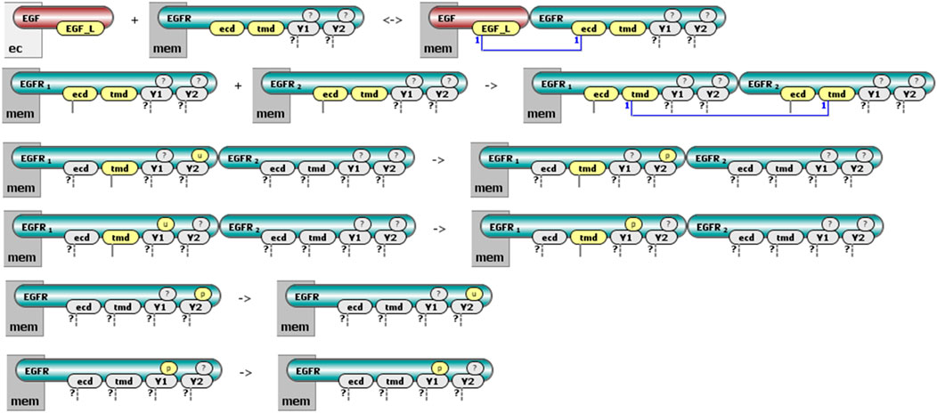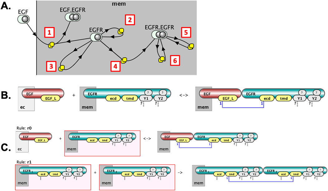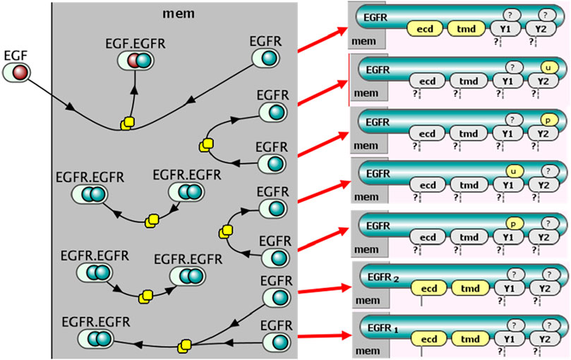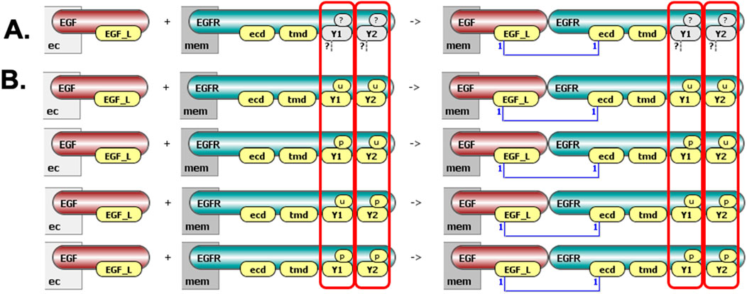 Figure 2. Visualization of a ligand-receptor binding rule in VCell. (A) This rule has two reactant patterns (ligand EGF and receptor EGFR) and one product pattern (EGF-EGFR complex). EGFR contains four interaction sites: extracellular domain (“ecd,” binds EGF), transmembrane domain (“tmd,” mediates receptor dimerization), and two distinct tyrosine residues (“Y1” and “Y2,” can be phosphorylated or involved in binding). Sites shown in yellow must be unbound; white indicates sites irrelevant for the rule (tyrosines can be phosphorylated/unphosphorylated and bound/unbound, as indicated by “?”). (B) Four explicit reactions generated by this rule, demonstrating all combinations of tyrosine phosphorylation states. “Mem” denotes membrane localization; “ec” denotes extracellular space.