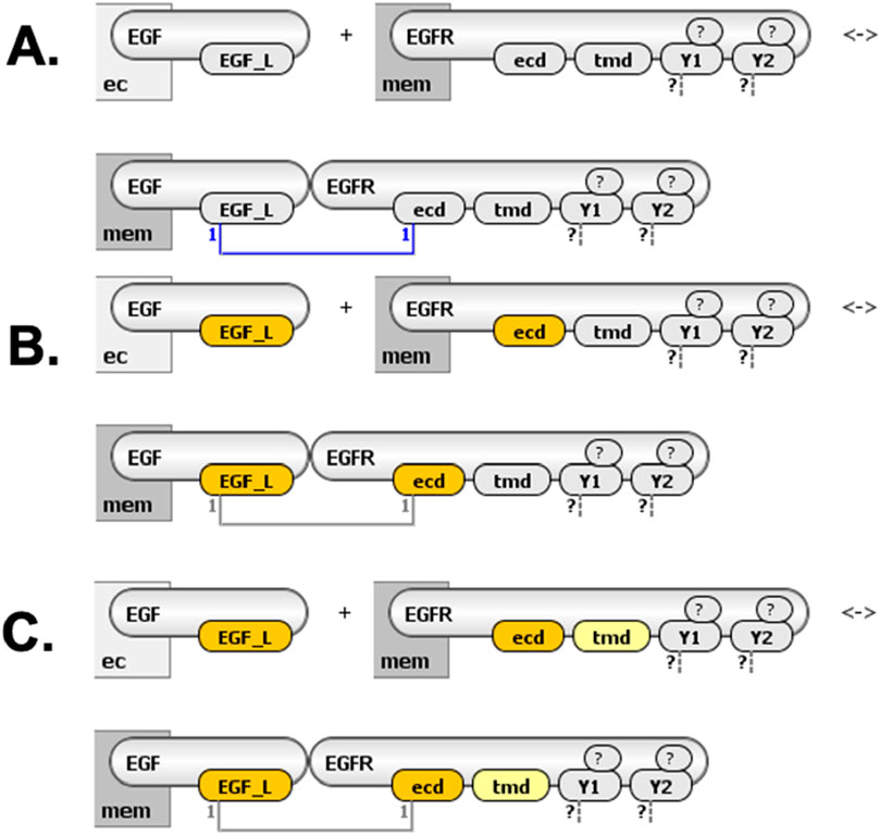 Figure 6. Highlighting site-specific reaction details in VCell. (A) Visualization without highlighting; all interacting molecules and sites displayed uniformly. (B) Sites undergoing modification by the reaction rule highlighted in bright yellow (e.g., receptor site “ecd” changing from “unbound” to “bound”). (C) Sites unchanged but required in a specific state (“molecular context”) highlighted in pale yellow (e.g., receptor site “tmd” must be unbound).