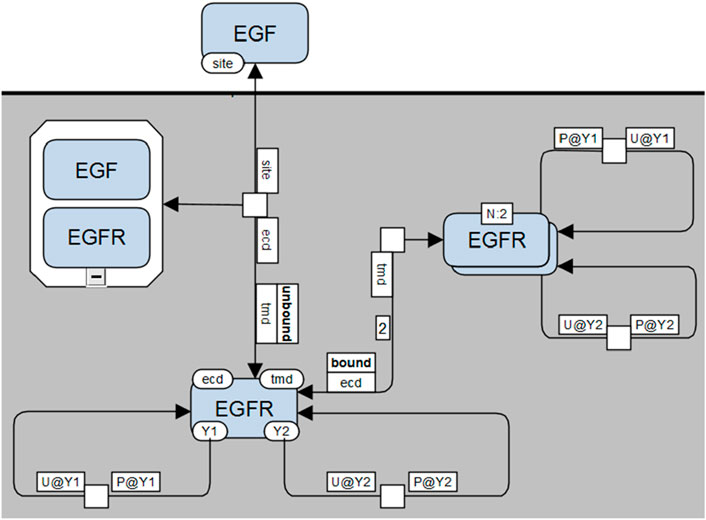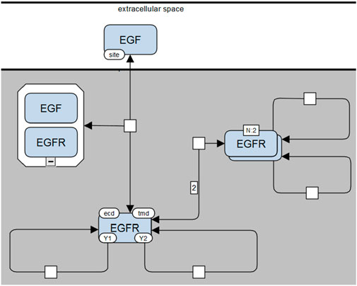 Traditionally, biological pathways are depicted as bipartite graphs, where nodes represent either molecular entities or processes, connected by edges indicating participation. Typically, the mathematical representation of a pathway mirrors its visual depiction. For example, the initial signaling events involving the EGF receptor (EGFR) described in multiple modeling papers such as Kholodenko et al., 1999; Schoeberl et al., 2002; Blinov et al., 2006a; Huang et al., 2017, include the following steps: (1) ligand (EGF) binding to EGFR; (2) dimerization of receptor-ligand complexes; (3) receptor tyrosine transphosphorylation; and (4) dephosphorylation of unprotected receptor sites by phosphatases. Figure 1 shows a reaction network corresponding to these events, created within the VCell modeling environment. In conventional modeling software tools such as VCell (Schaff et al., 1997), COPASI (Hoops et al., 2006), or CellDesigner (Funahashi et al., 2003), each chemical species and reaction must be explicitly and manually specified and localized to appropriate compartments (membranes or volumes). However, manual specification inherently limits the complexity and scale of representable models due to the rapidly growing number of potential species and interactions.