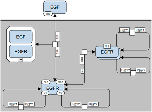 Figure 7. Molecular Process Diagram in SBGN-compliant notation (corresponding to the VCell representation shown in Figure 5A). EGF and EGFR represented by macromolecule glyphs; EGF-EGFR complexes use container glyphs, and EGFR dimers use multimer glyphs. Molecular sites (“site,” “ecd,” “tmd,” “Y1,” “Y2”) shown as state variable glyphs (once per molecule). Stoichiometries greater than one explicitly shown on arcs (e.g., “2” for dimerization).