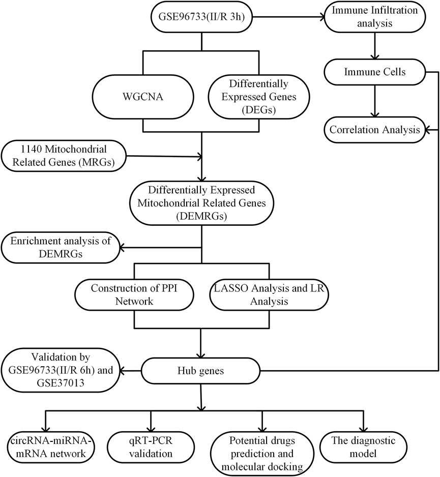 There has been a lot of research looking at the role of mitochondria as regulators in II/R injury, but most of it has ignored the immune microenvironment and how non-coding RNAs affect target gene expression, focusing instead on the biological functions carried out by individual genes and how mitochondrial function is regulated. Hence, we used biological analysis to filter hub genes linked to immune infiltration and mitochondrial function, and we gathered II/R damage information from public databases. Using these hub genes as nodes, we built a circRNA-miRNA-mRNA regulatory network and used it to forecast the diagnosis of II/R injury. In order to assess the binding affinity of medications with important target proteins, we conducted molecular docking simulations and also projected prospective therapeutic molecules. Finally, qRT-PCR validation provided new insights into the etiology of II/R injury and underscored the critical role of these hub genes.